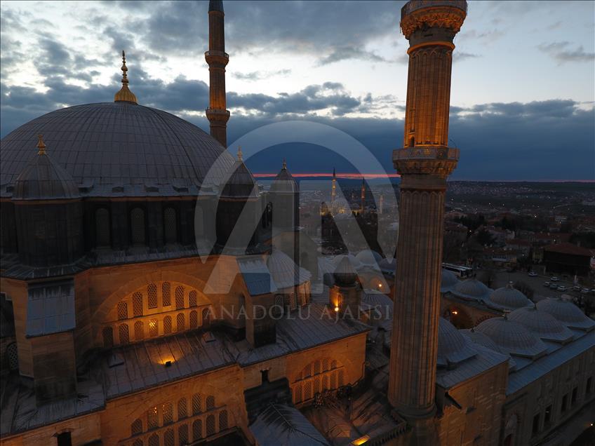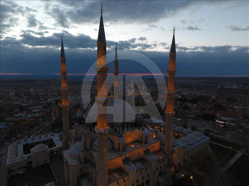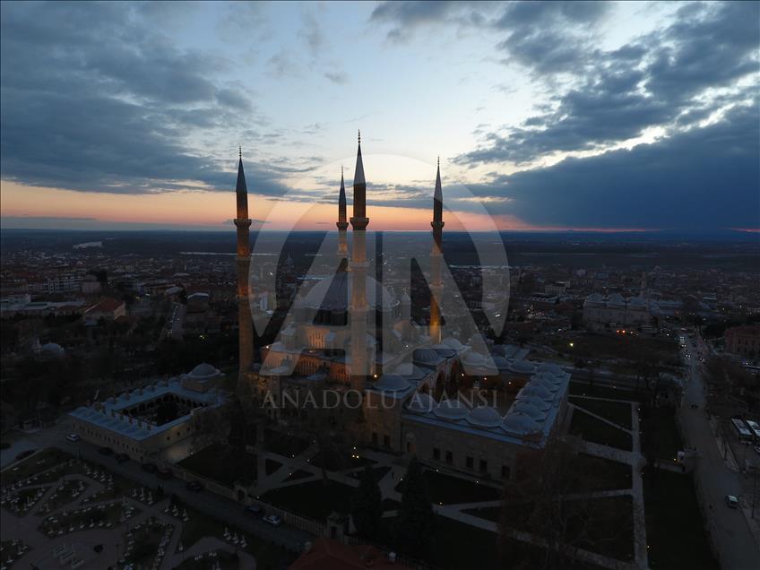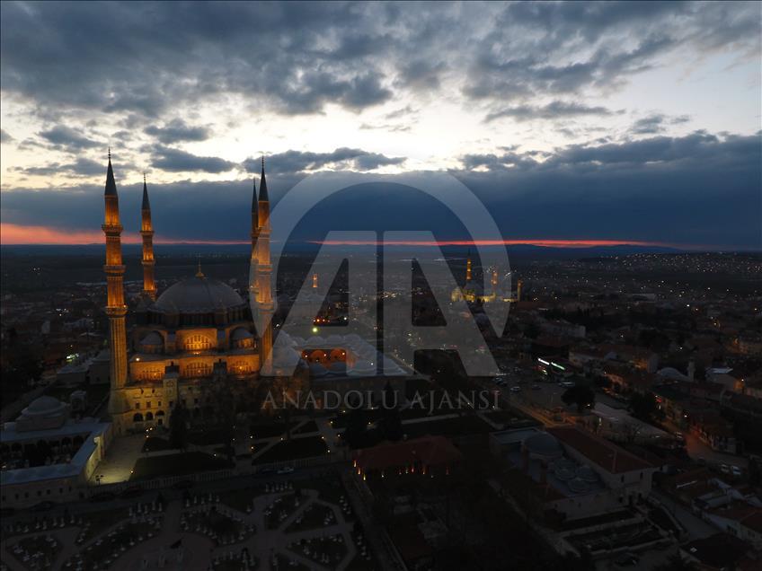 Edirne'de UNESCO Dünya Miras Listesi'nde yer alan Mimar Sinan'ın ustalık eseri Selimiye Camisi, gün batımında gökyüzünün farklı renkleriyle bütünleşti.