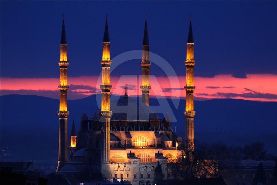 Edirne'de UNESCO Dünya Miras Listesi'nde yer alan Mimar Sinan'ın ustalık eseri Selimiye Camisi, gün batımında gökyüzünün farklı renkleriyle bütünleşti. ( Cihan Demirci - Anadolu Ajansı )Cihan Demirci