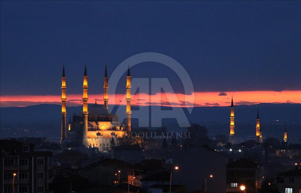 Edirne'de UNESCO Dünya Miras Listesi'nde yer alan Mimar Sinan'ın ustalık eseri Selimiye Camisi, gün batımında gökyüzünün farklı renkleriyle bütünleşti. ( Salih Baran - Anadolu Ajansı )Salih Baran