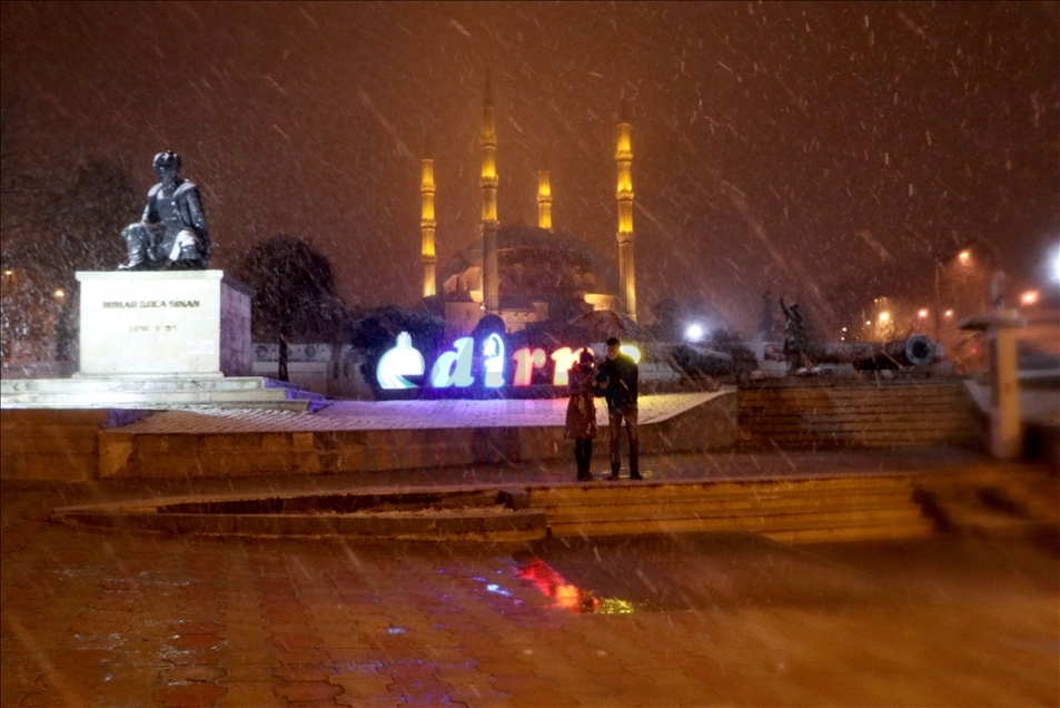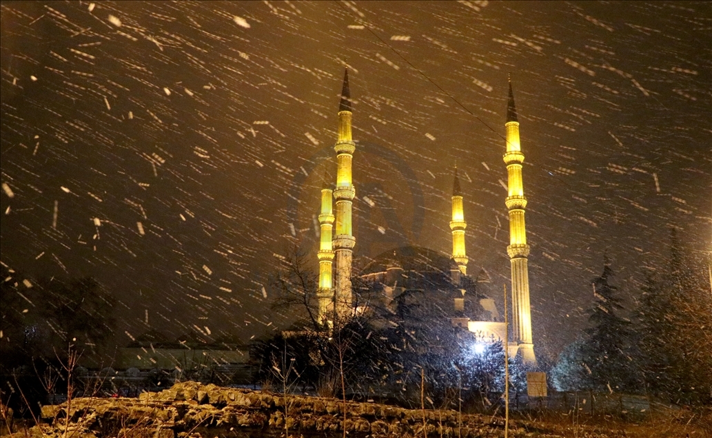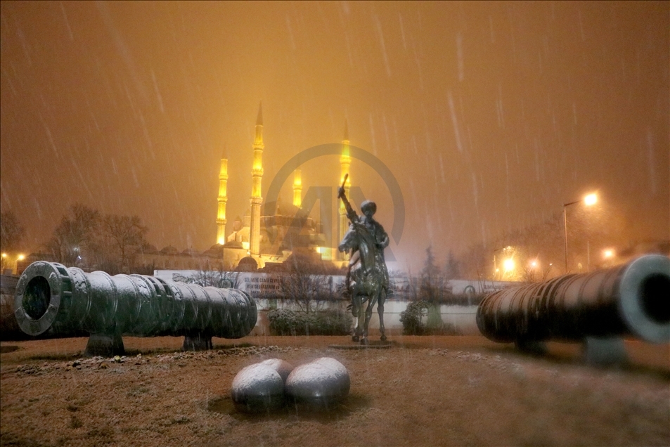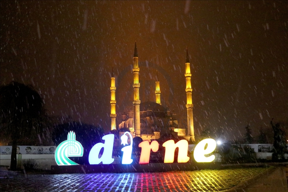 Edirne'de akşam saatlerinde başlayan yağmur, hava sıcaklığının düşmesiyle kar yağışına dönüştü. Selimiye Camisi kar yağışıyla görsel güzellik oluşturdu. ( Gökhan Zobar - Anadolu Ajansı )Gökhan Zobar