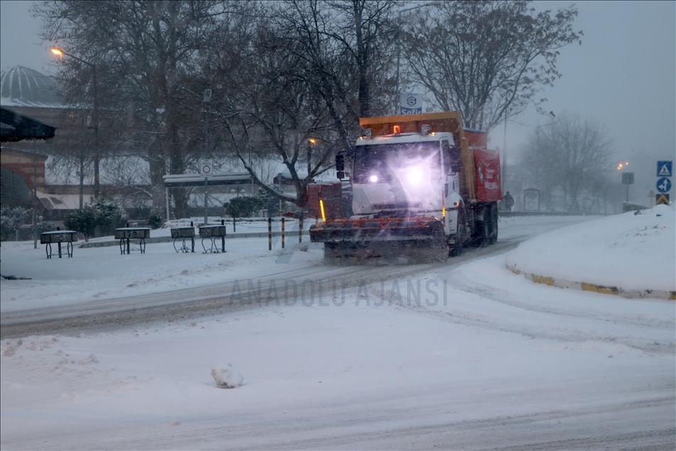 Edirne'de dün akşam saatlerinde başlayan kar yağışı etkisini artırarak devam ediyor. Kar yağışı nedeniyle kent beyaza büründü. Ekipler, kar temizleme çalışması yapıyor. ( Gökhan Zobar - Anadolu Ajansı )Gökhan Zobar