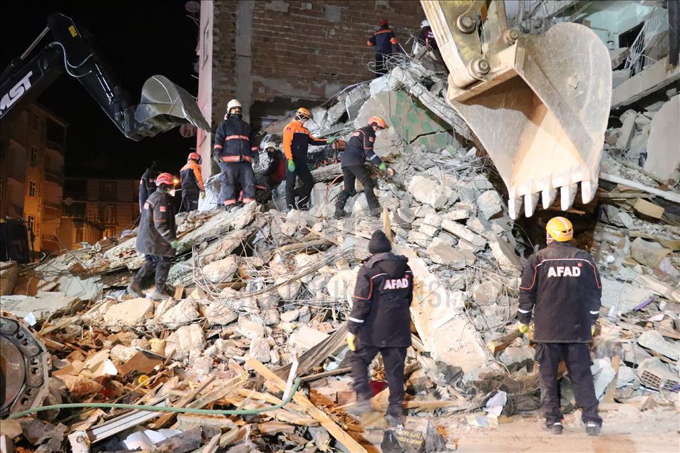 Elazığ'ın Sivrice ilçesinde meydana gelen depremde Mustafa Paşa Mahallesindeki yıkılan binada arama kurtarma çalışmaları devam ediyor. ( Suat ÖZTÜRK - Anadolu Ajansı )Suat ÖZTÜRK