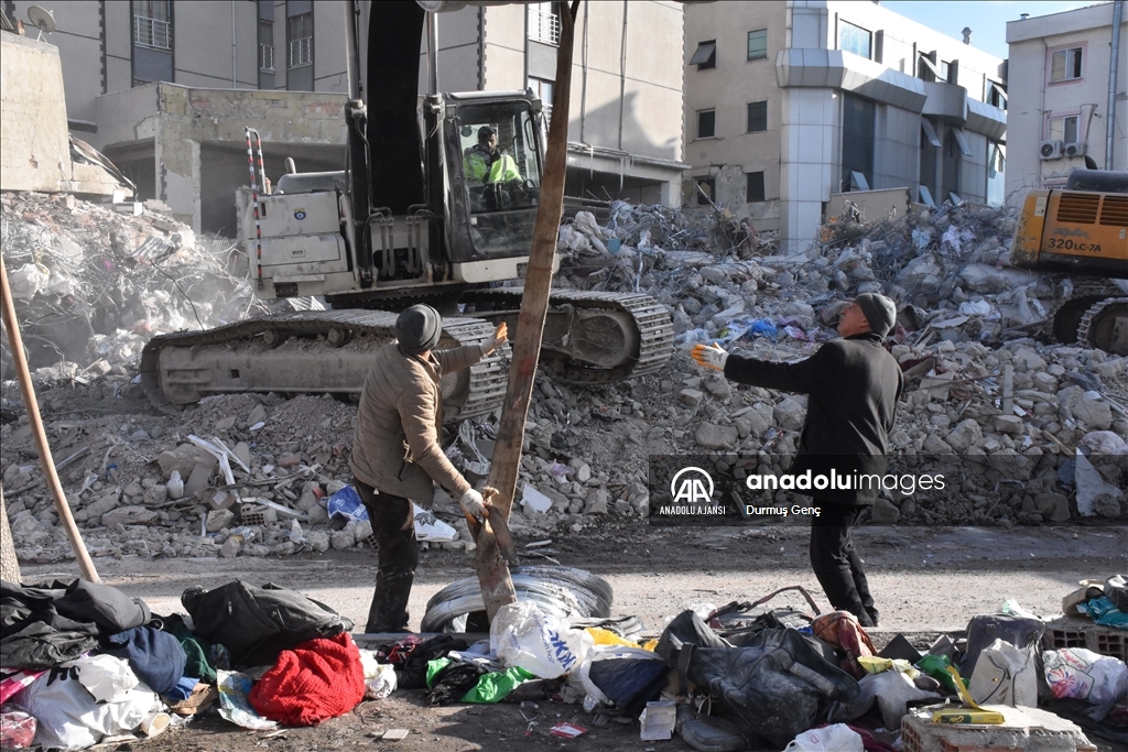"Asrın felaketi" olarak nitelenen depremlerde 2 binin üzerinde binanın yıkıldığı Kahramanmaraş'ın Elbistan ilçesinde enkaz kaldırma çalışmaları sürüyor. Yıkım çalışmalarının sürdüğü binalarda bazı ev sahipleri, enkazlardan çıkan değerli eşyalarını topluyor. ( Durmuş Genç - Anadolu Ajansı )Durmuş Genç