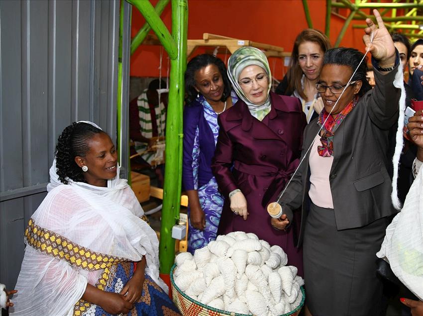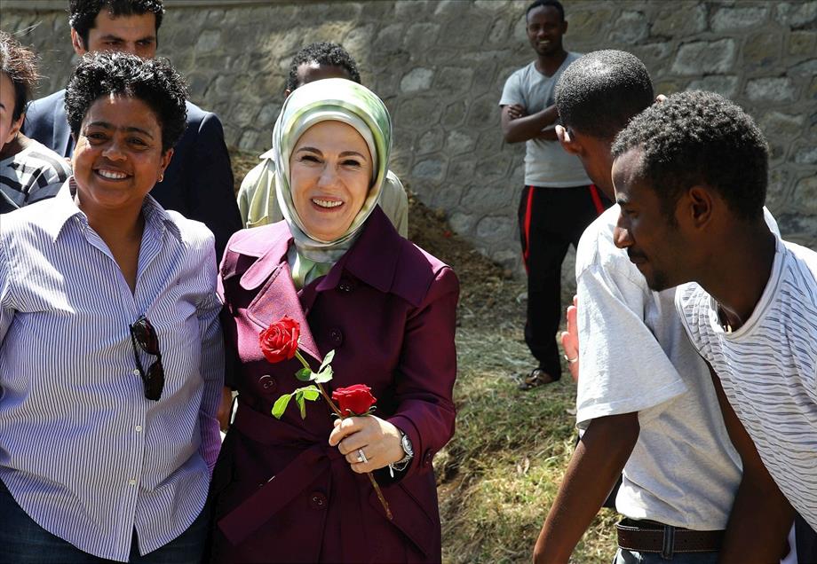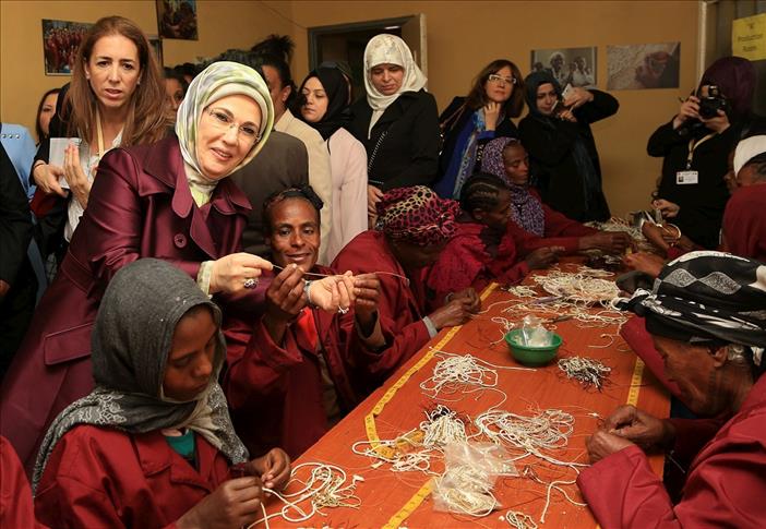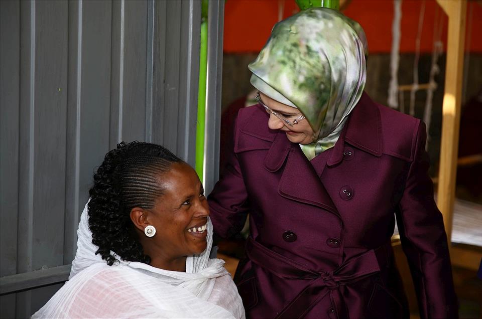 Cumhurbaşkanı Recep Tayyip Erdoğan'ın eşi Emine Erdoğan, Afrika Boynuzu ülkelerini kapsayan resmi ziyaretin ilk durağı olan Etiyopya'nın başkenti Addis Ababa'da, aidsli kadınlar yararına faaliyet gösteren bir derneği ziyaret etti. Erdoğan, kadınlarla bir süre sohbet ettikten sonra, atık maddelerin geri dönüşümünden sağlanan takı ve süs eşyalarını inceledi.