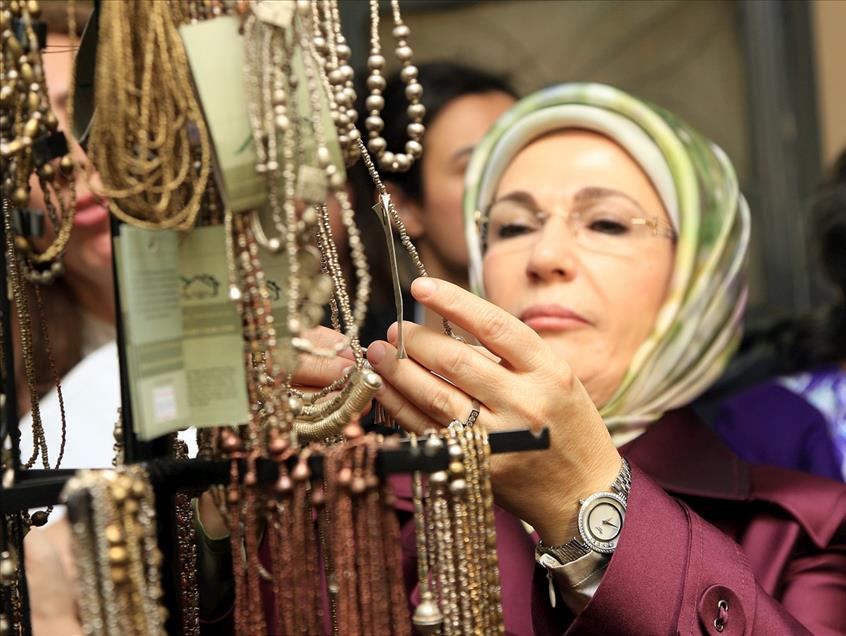 Cumhurbaşkanı Recep Tayyip Erdoğan'ın eşi Emine Erdoğan, aidsli kadınlar yararına faaliyet gösteren bir derneği ziyaret ederek, buradaki kadınlarla bir süre sohbet ettikten sonra, atık maddelerin geri dönüşümünden sağlanan malzemeler ile yapılan takı ve süs eşyalarını inceledi. Emine Erdoğan'a burada yerel yiyecekler ikram edildi. (Yasin Bülbül-Cumhurbaşkanlığı - Anadolu Ajansı)Yasin Bülbül-Cumhurbaşkanlığı