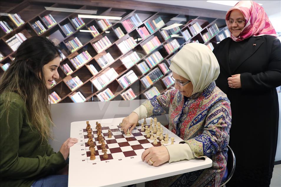 Türkiye Cumhurbaşkanı Recep Tayyip Erdoğan'ın eşi Emine Erdoğan, Mardin Büyükşehir Belediyesi Gençlik Merkezi'nde gençlerle bir araya geldi. Emine Erdoğan, burada bir genç kızla satranç oynadı. Erdoğan'a, Aile, Çalışma ve Sosyal Hizmetler Bakanı Zehra Zümrüt Selçuk (sağda) da eşlik etti. ( Cem Öksüz - Anadolu Ajansı )Cem Öksüz
