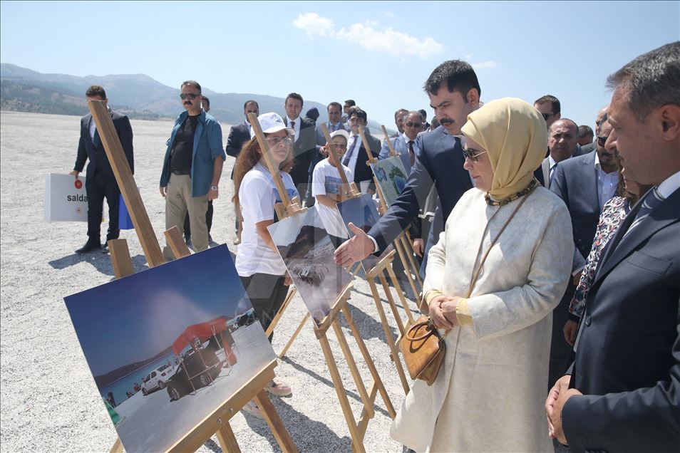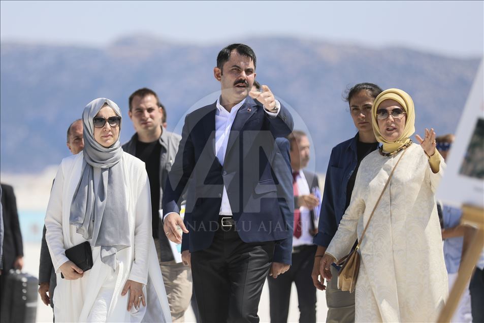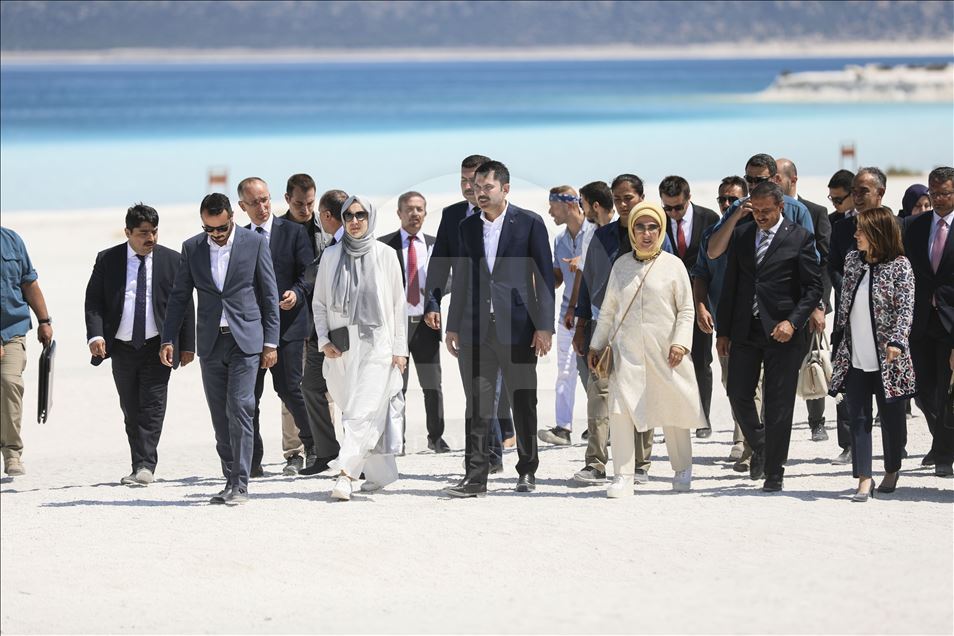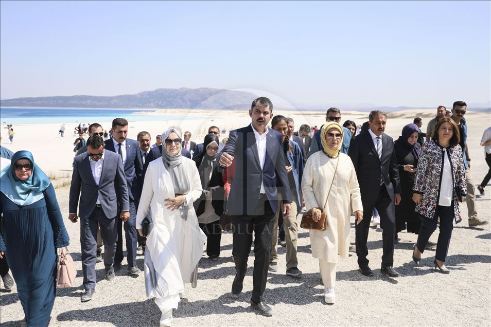 Türkiye Cumhurbaşkanı Erdoğan'ın eşi Emine Erdoğan ve Çevre ve Şehircilik Bakanı Murat Kurum, Burdur'un Yeşilova ilçesinde yer alan Salda Gölü'nü gezdi, burada yürütülen proje kapsamında bilgi aldı. ( Mustafa Çiftçi - Anadolu Ajansı )Mustafa Çiftçi