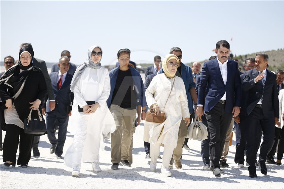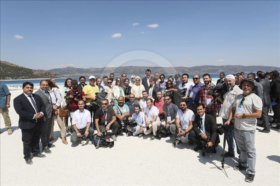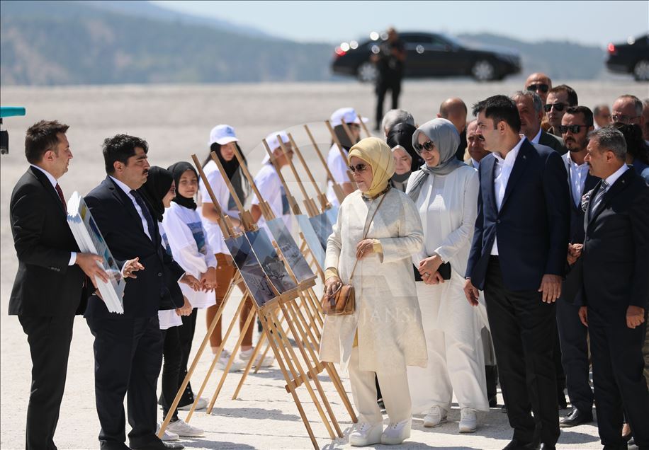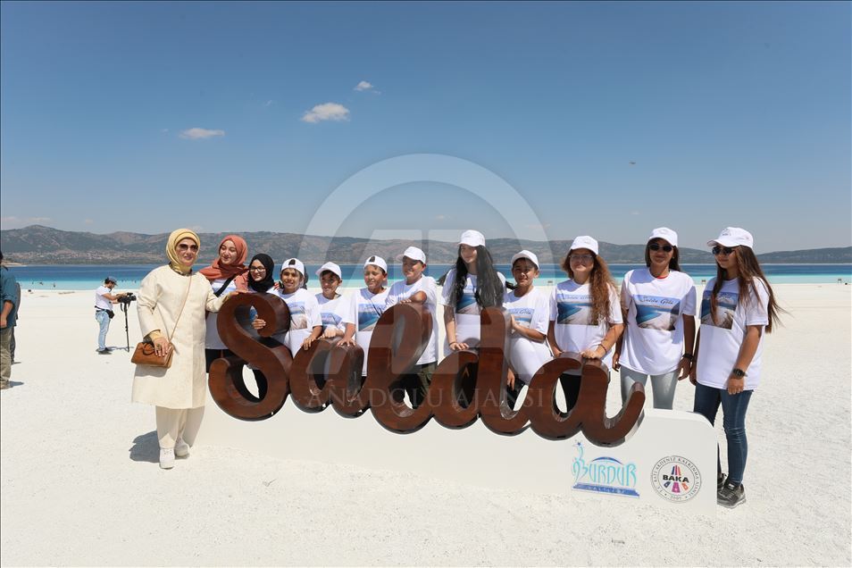 Türkiye Cumhurbaşkanı Recep Tayyip Erdoğan'ın eşi Emine Erdoğan, Burdur'un Yeşilova ilçesinde yer alan Salda Gölü'nde incelemede bulunarak, burada yürütülen proje hakkında bilgi aldı. Erdoğan, katılımcılarla fotograf çektirdi. ( Abdulhamit Topal - Anadolu Ajansı )Abdulhamit Topal