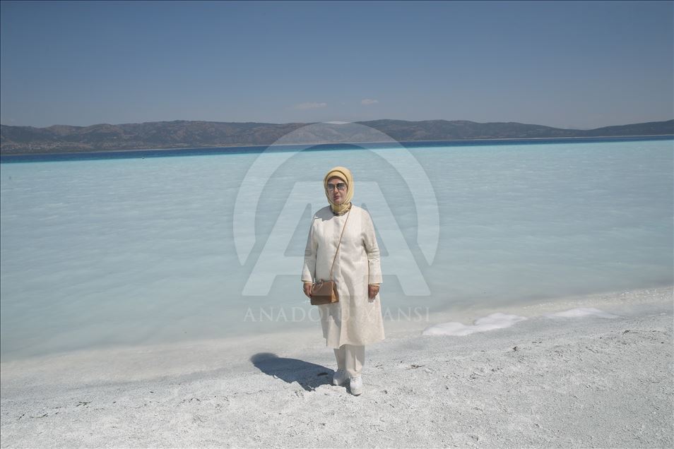 Türkiye Cumhurbaşkanı Erdoğan'ın eşi Emine Erdoğan, Burdur'un Yeşilova ilçesinde yer alan Salda Gölü'nü gezdi, burada yürütülen proje kapsamında bilgi aldı. ( Murat Kula - Anadolu Ajansı )Murat Kula