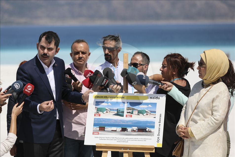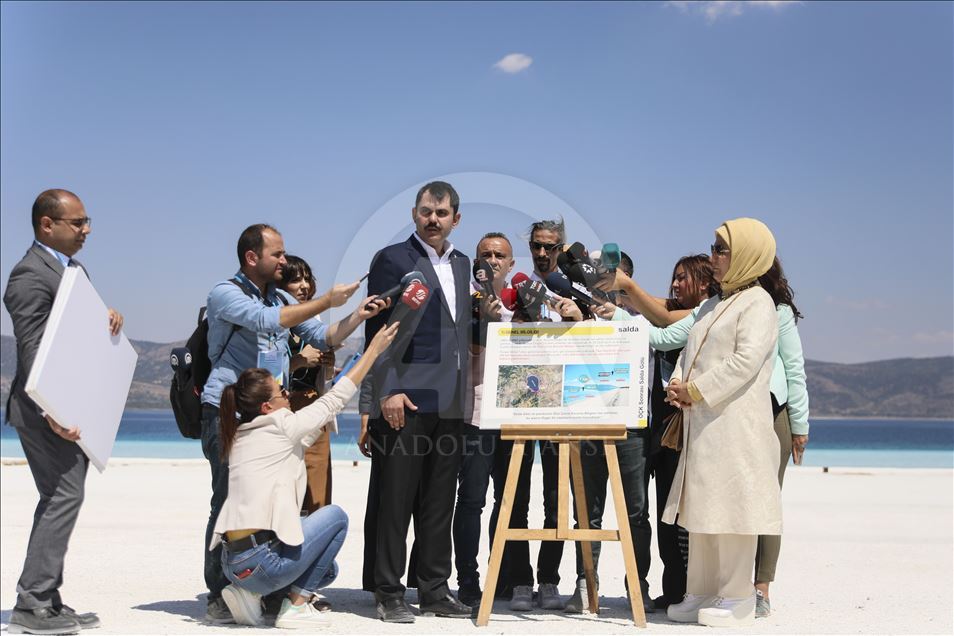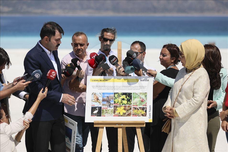 Türkiye Cumhurbaşkanı Recep Tayyip Erdoğan'ın eşi Emine Erdoğan ve Çevre ve Şehircilik Bakanı Murat Kurum, Burdur'un Yeşilova ilçesinde yer alan Salda Gölü'nde incelemede bulundu. Erdoğan, basın mensuplarının sorularını yanıtladı. ( Abdulhamit Topal - Anadolu Ajansı )Abdulhamit Topal