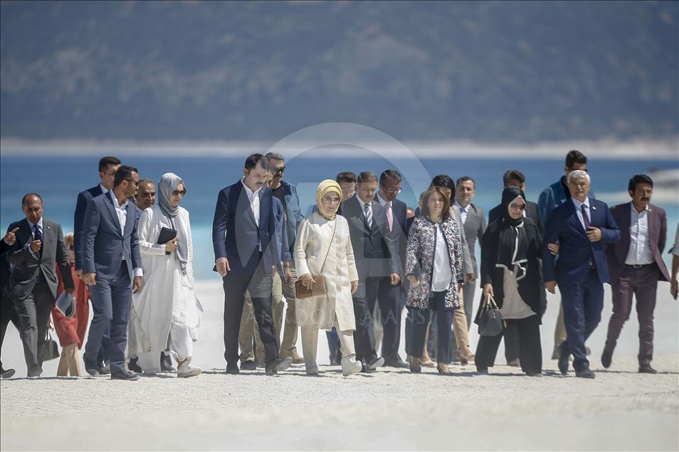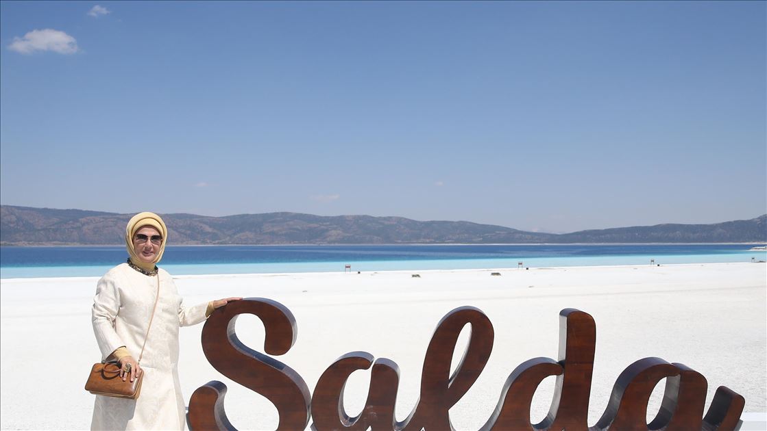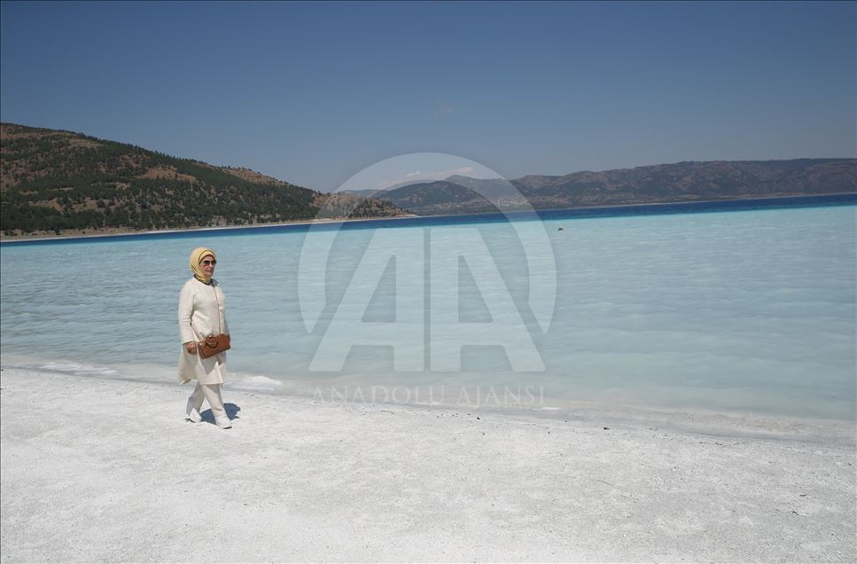 Emine Erdoğan, Çevre ve Şehircilik Bakanı Kurum ile Burdur'daki beyaz kumsalları ve turkuaz rengi nedeniyle "Türkiye'nin Maldivleri" olarak ünlenen Salda Gölü'nü gezip çalışmalar hakkında bilgi aldı.