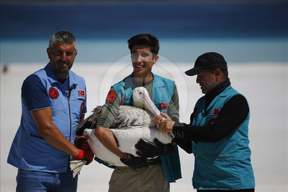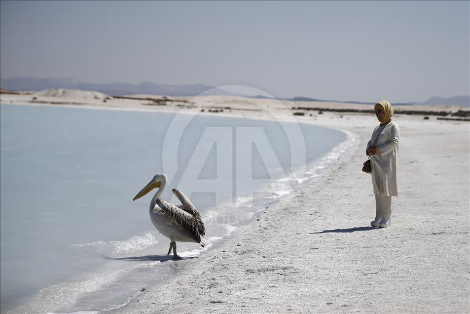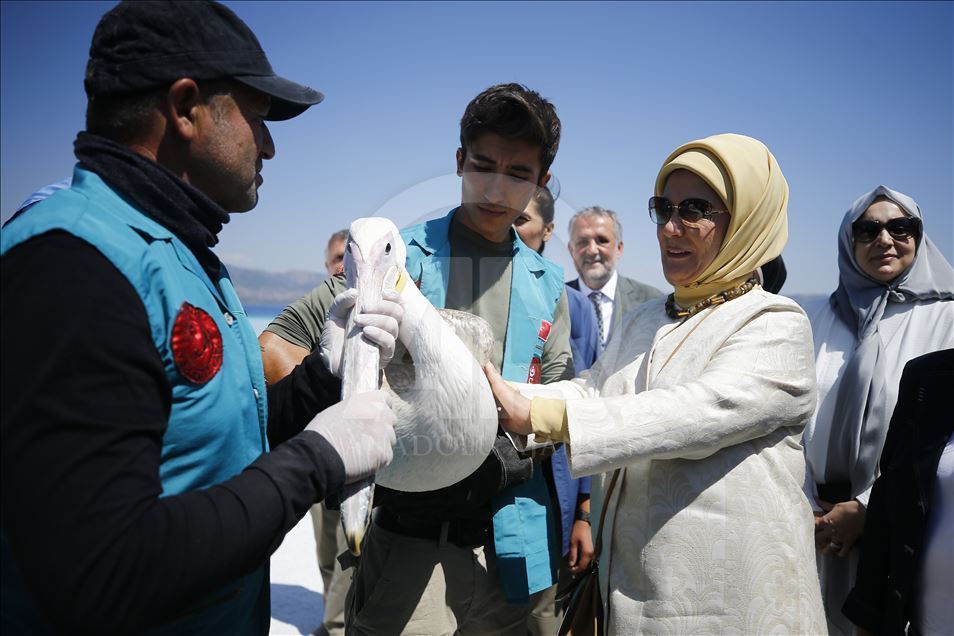 Türkiye Cumhurbaşkanı Erdoğan'ın eşi Emine Erdoğan, Burdur'un Yeşilova ilçesinde yer alan Salda Gölü'nü gezdi, burada yürütülen proje kapsamında bilgi aldı. Erdoğan, tedavisi tamalanan bir pelikanın doğal ortamına bırakılmasına yardım etti. ( Mustafa Çiftçi - Anadolu Ajansı )Mustafa Çiftçi