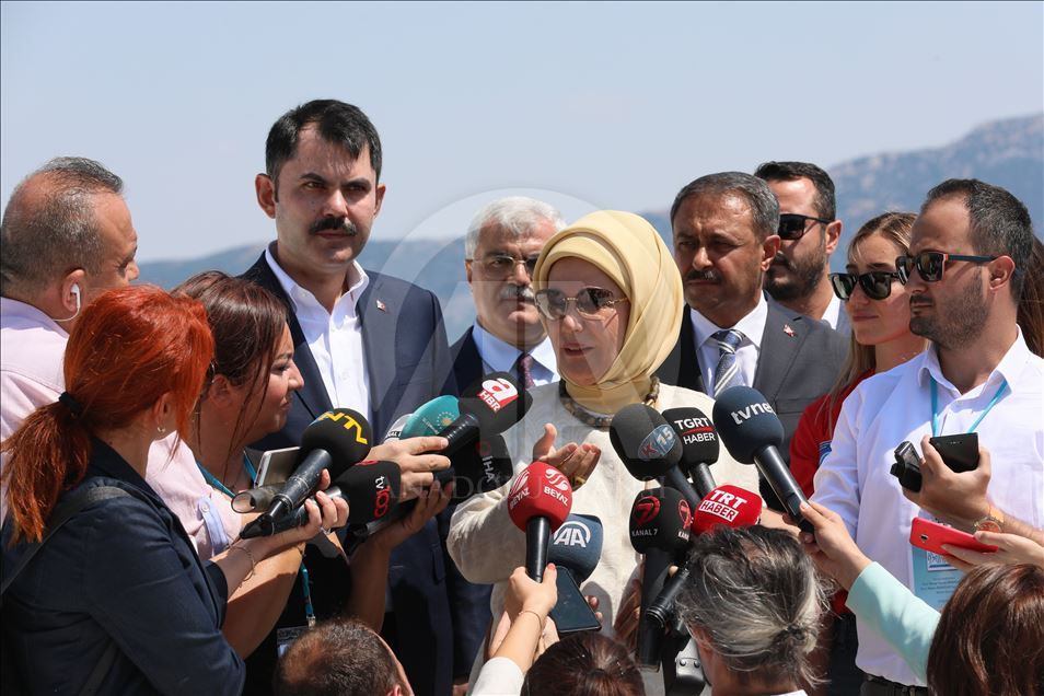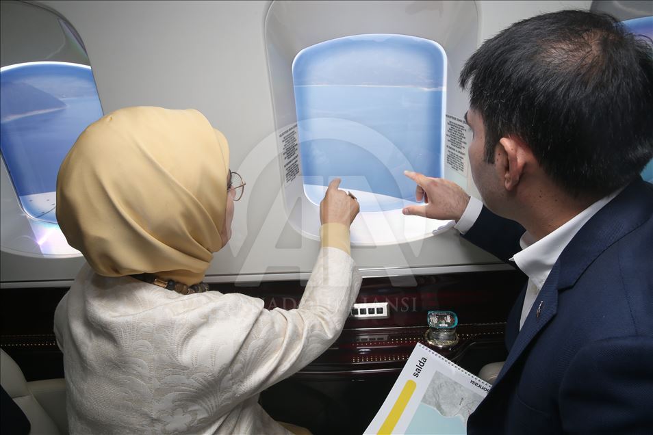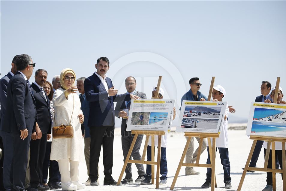 Türkiye Cumhurbaşkanı Recep Tayyip Erdoğan'ın eşi Emine Erdoğan ve Çevre ve Şehircilik Bakanı Murat Kurum, Burdur'un Yeşilova ilçesinde yer alan Salda Gölü'nde incelemede bulundu, burada yürütülen proje hakkında bilgi aldı. ( Mustafa Çiftçi - Anadolu Ajansı )Mustafa Çiftçi