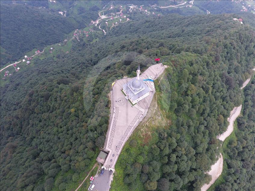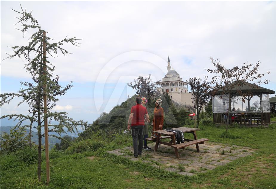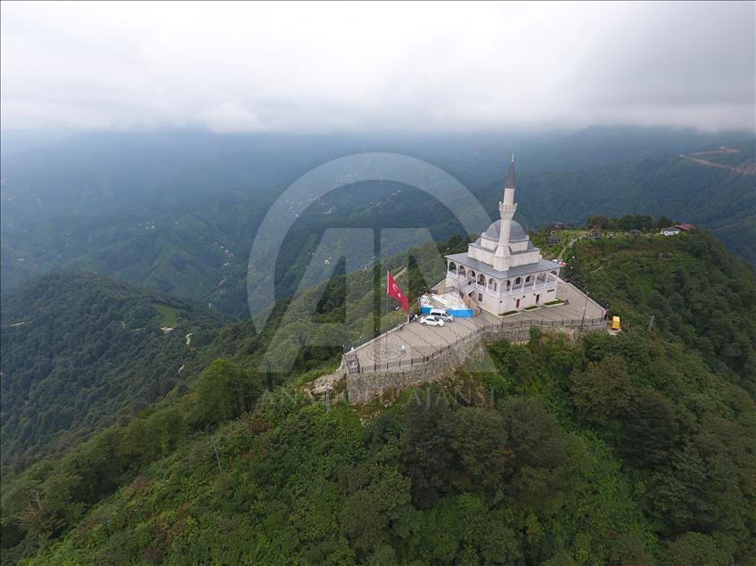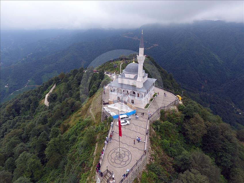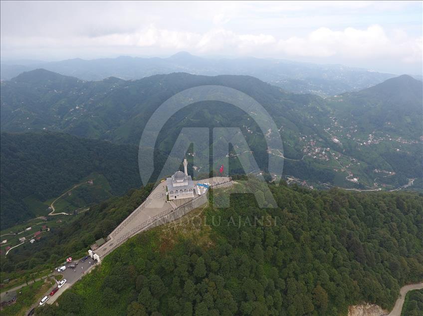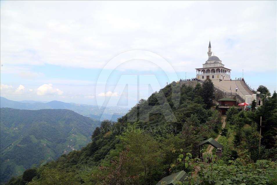 Cumhurbaşkanı Recep Tayyip Erdoğan'ın baba ocağı Rize'nin Güneysu ilçesindeki bin 130 rakımlı Kıble Dağı'nın zirvesine inşa edilen ve manzarasıyla ziyaretçilerin ilgisini çeken Kıble Dağı Hacı Hafız Yusuf Yılmaz Camisi adeta ziyaretçi akınına uğruyor.