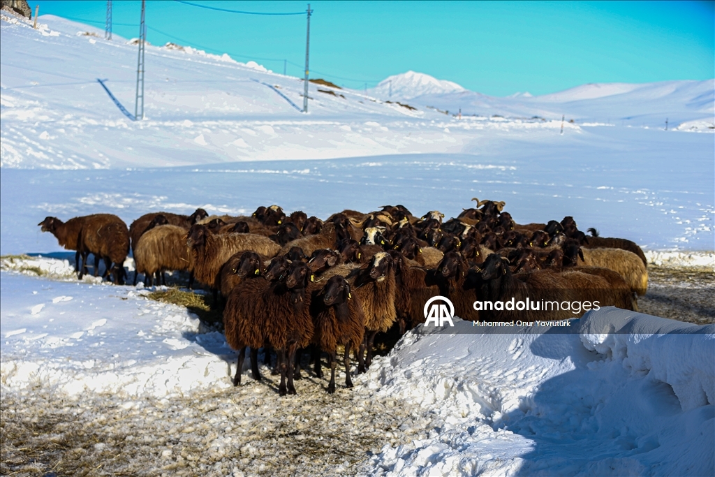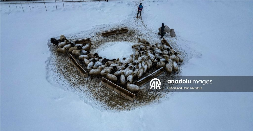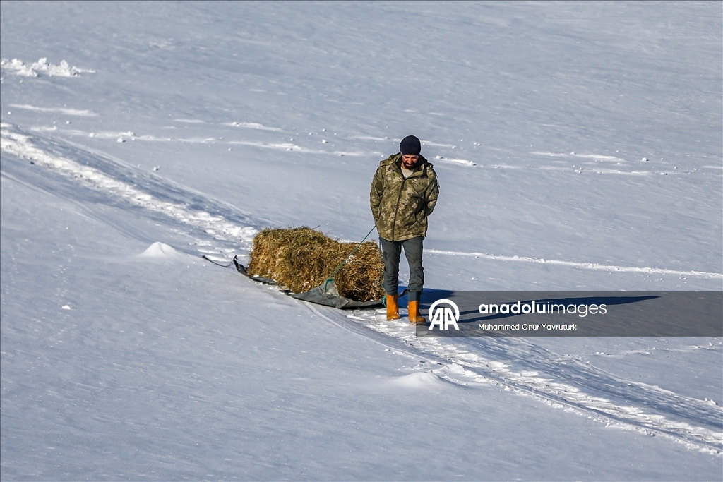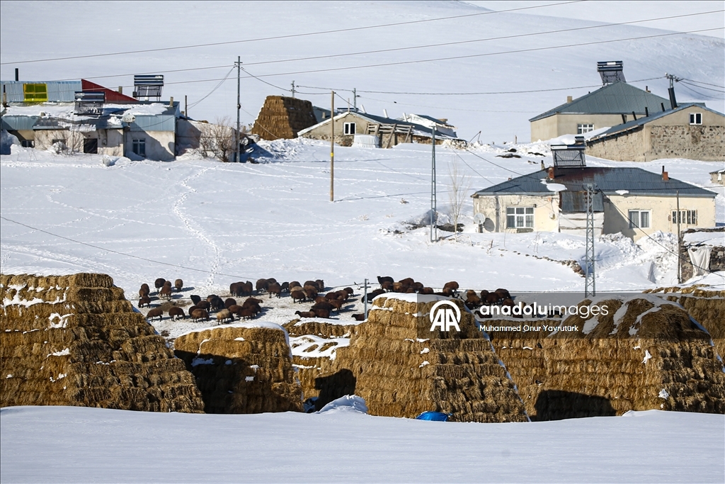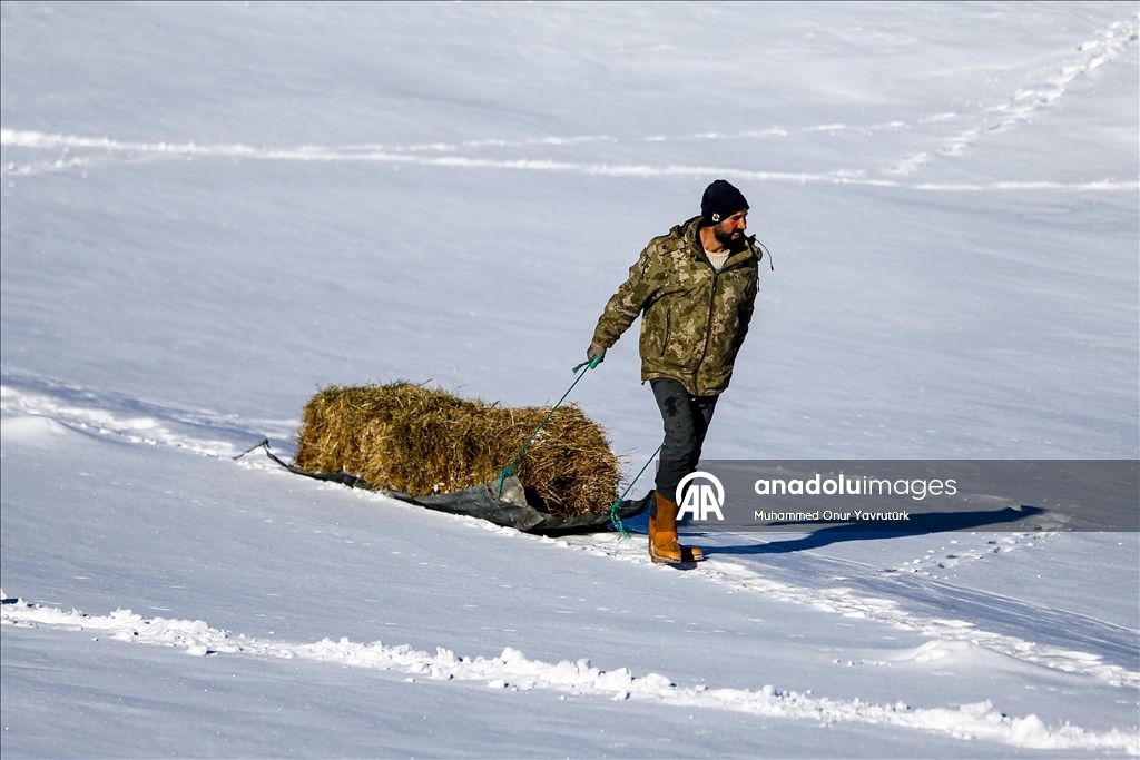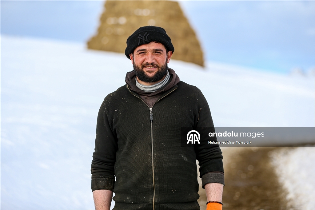 Erzurum'un kırsalındaki besiciler, yer yer 3 metreyi bulan kar ve dondurucu soğuğa karşı mücadele ederek hayvanlarını beslemeye devam ediyor.