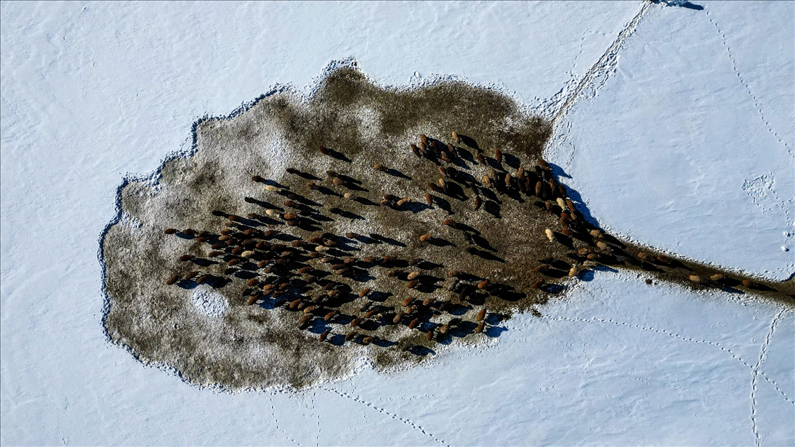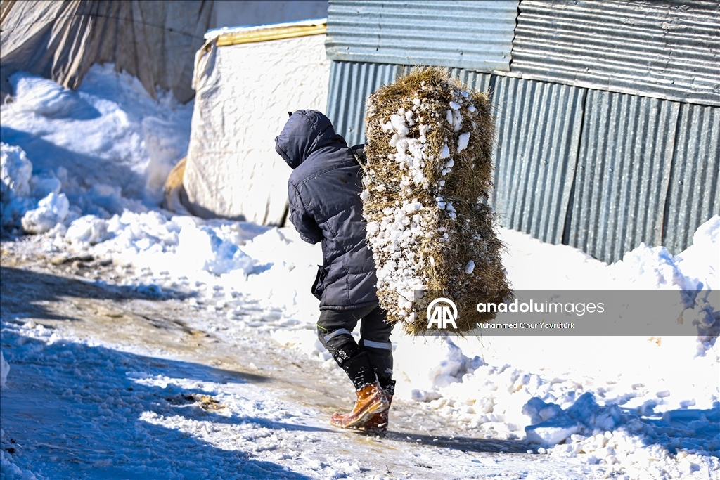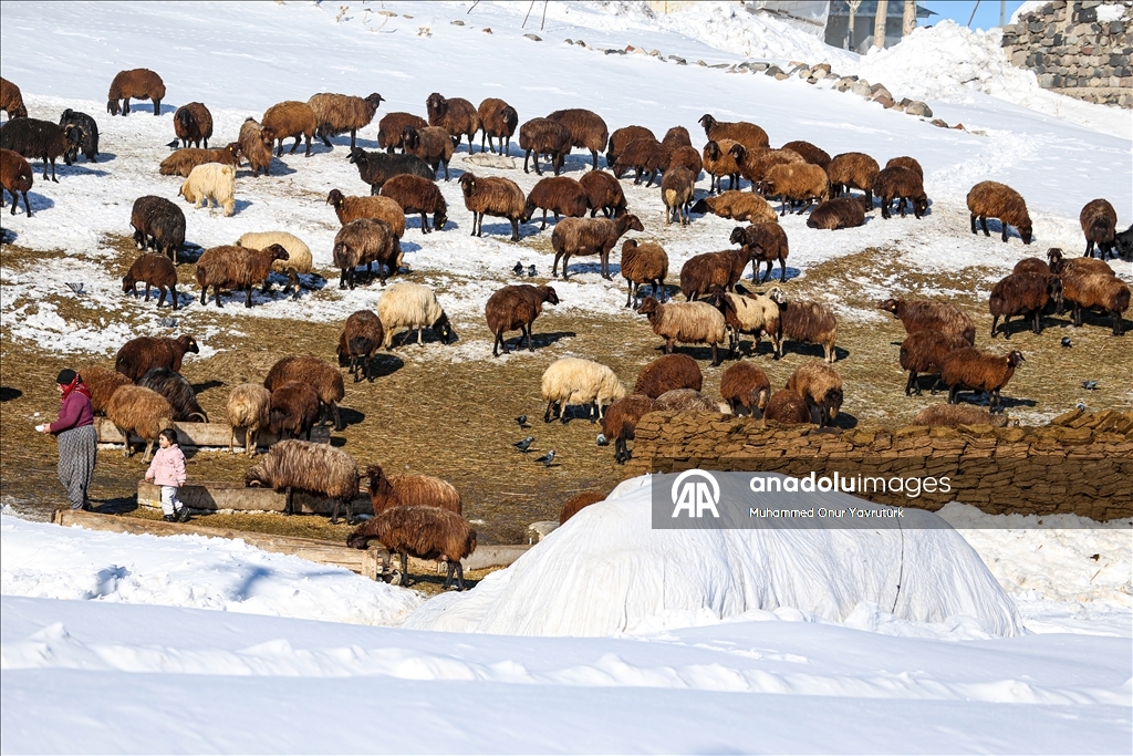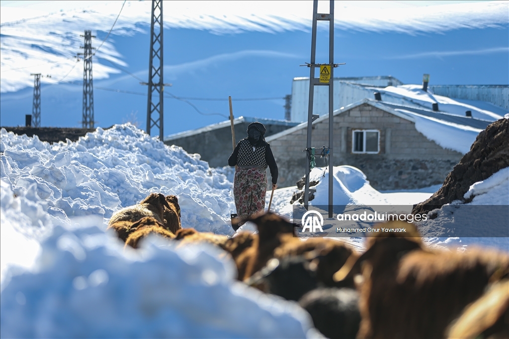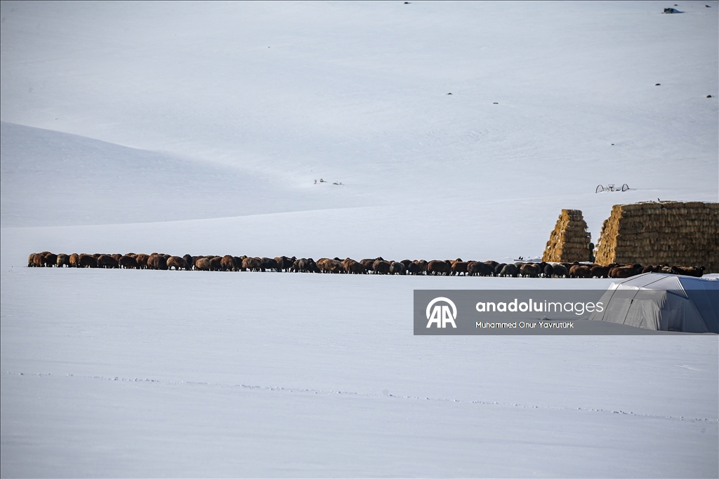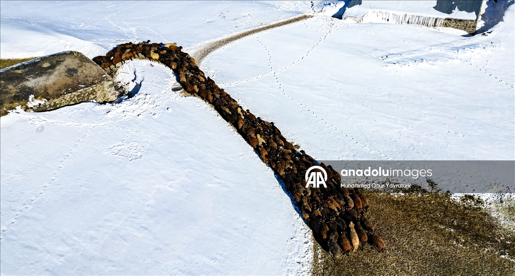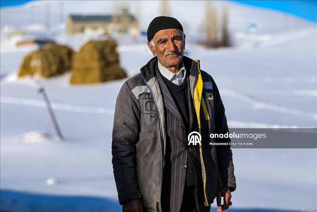 Erzurum'un kırsalındaki besiciler, yer yer 3 metreyi bulan kar ve dondurucu soğuğa karşı mücadele ederek hayvanlarını beslemeye devam ediyor.