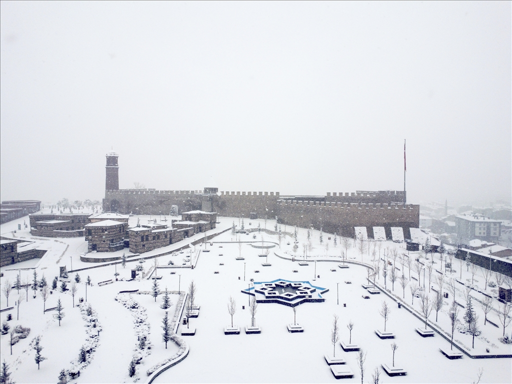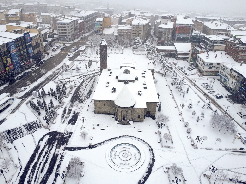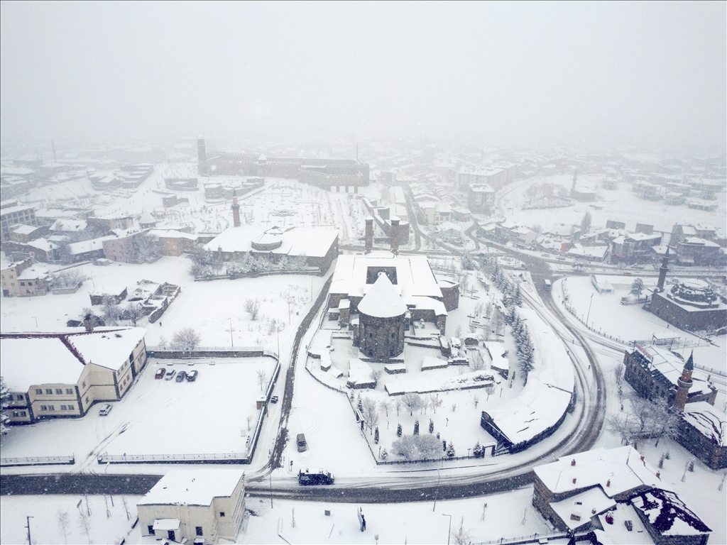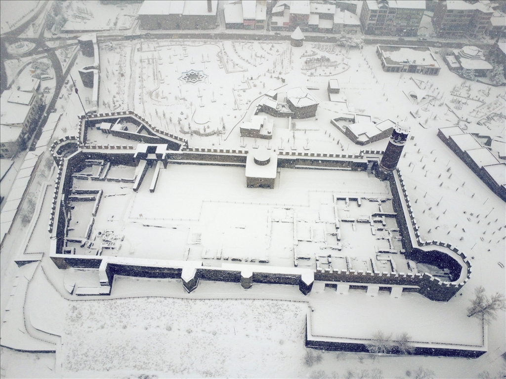 Erzurum'da son günlerde aralıkla yağan kar, akşam saatlerinde yeniden başladı. Gece boyunca devam eden ve etkisini artıran yoğun yağış sonrası kent merkezinde kar kalınlığı yaklaşık 15 santimetreye ulaştı. Beyaza bürünen kent merkezi ve tarihi yerler havadan görüntülendi. ( Faruk Küçük - Anadolu Ajansı )Faruk Küçük