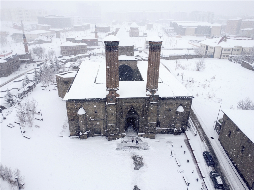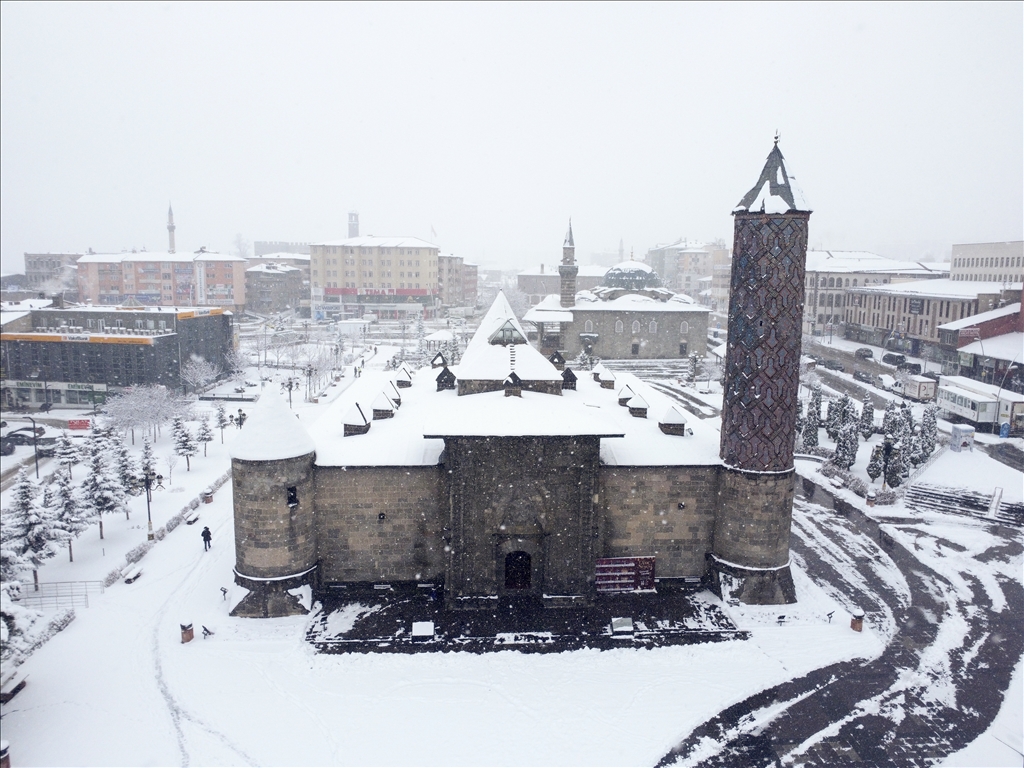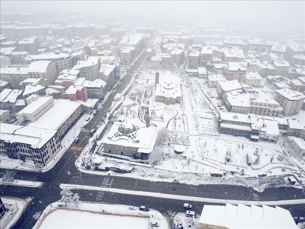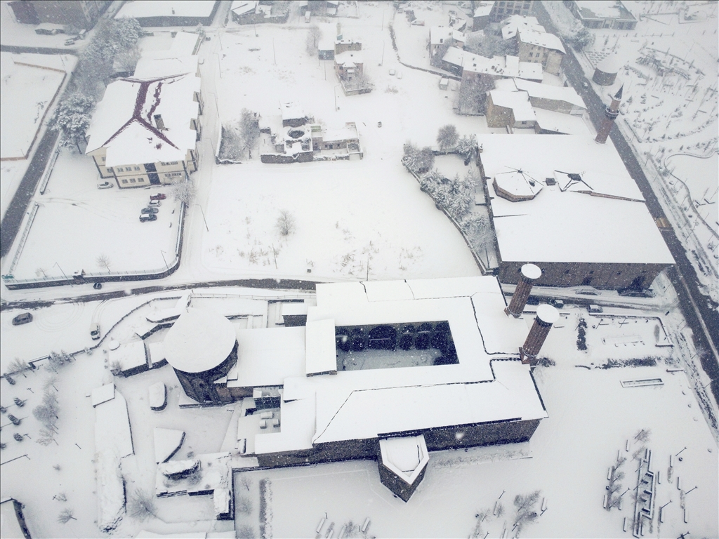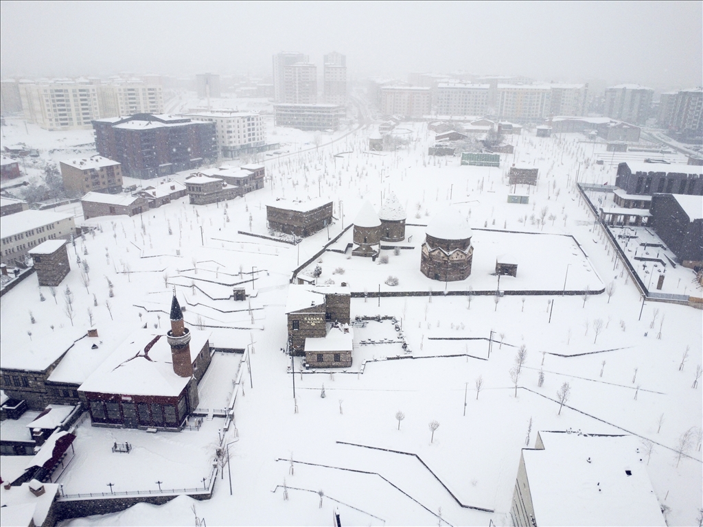 Erzurum'da son günlerde aralıkla yağan kar, akşam saatlerinde yeniden başladı. Gece boyunca devam eden ve etkisini artıran yoğun yağış sonrası kent merkezinde kar kalınlığı yaklaşık 15 santimetreye ulaştı. Beyaza bürünen kent merkezi ve tarihi yerler havadan görüntülendi. ( Faruk Küçük - Anadolu Ajansı )Faruk Küçük