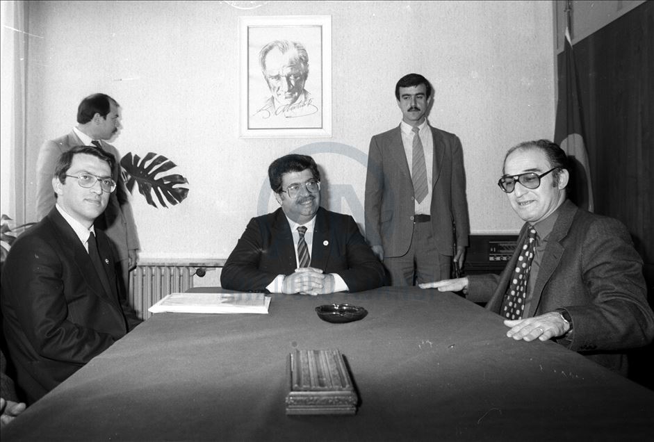 Eski Başbakanlardan Mesut Yılmaz hayatını kaybetti. 10 Nisan 1984'de Başbakan Turgut Özal (ortada), Türkiye Gazeteciler Sendikası Genel Merkezini ziyaretinde Genel Başkan Oktay Kurtböke (sağda) ile görüştü. Başbakan Özal'a Devlet Bakanı Yılmaz (solda) eşlik etti. (Arşiv)