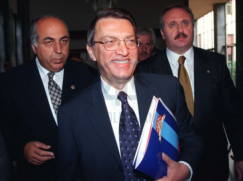 Eski Başbakanlardan Mesut Yılmaz hayatını kaybetti. 23 Haziran 1999'da 57. Hükümeti oluşturan partilerin liderleri Başbakan Bülent Ecevit (ortada), Devlet Bakanı ve Başbakan Yardımcısı Devlet Bahçeli (solda) ve Anap Genel Başkanı Yılmaz (solda) bir araya geldi. (Arşiv)