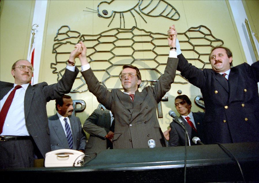 Eski Başbakanlardan Mesut Yılmaz hayatını kaybetti. 16 Haziran 1991'de Anap genel başkanlığına seçilen Yılmaz (ortada), Anap Genel Merkezi'nde delegelerle toplantı yaptı. Toplantıda Anap Milletvekili Mustafa Taşar ve Bülent Akarcalı da yer aldı. (Arşiv)