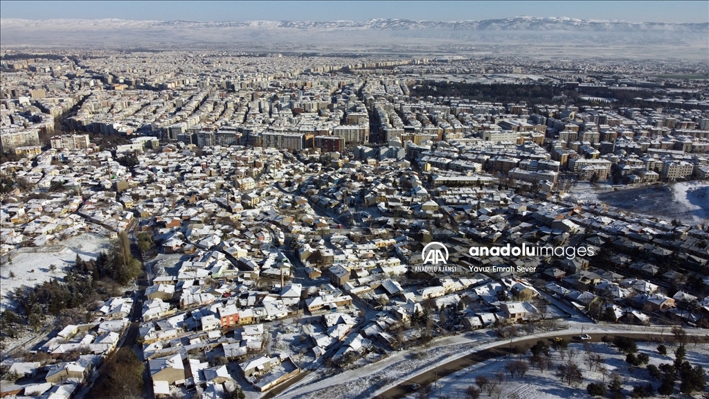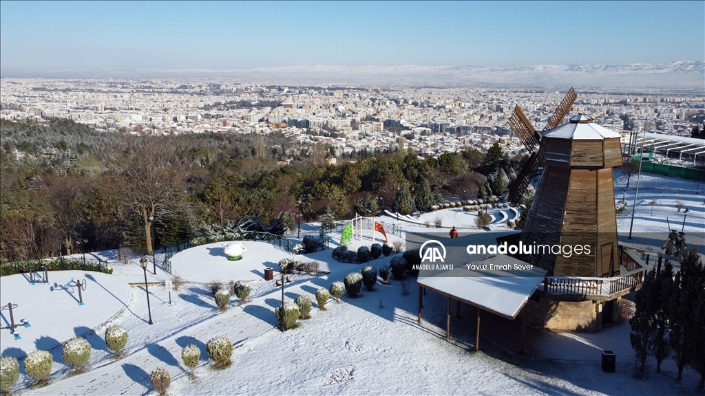 Eskişehir'de hava sıcaklığının düşmesinin ardından yağan kar, kent merkezinde beyaz örtü oluşturdu. Odunpazarı ilçesi Çankaya Mahallesi'ndeki "Don Kişot" temalı Şelale Park'ın karlı manzaraları dronla görüntülendi. ( Yavuz Emrah Sever - Anadolu Ajansı )Yavuz Emrah Sever
