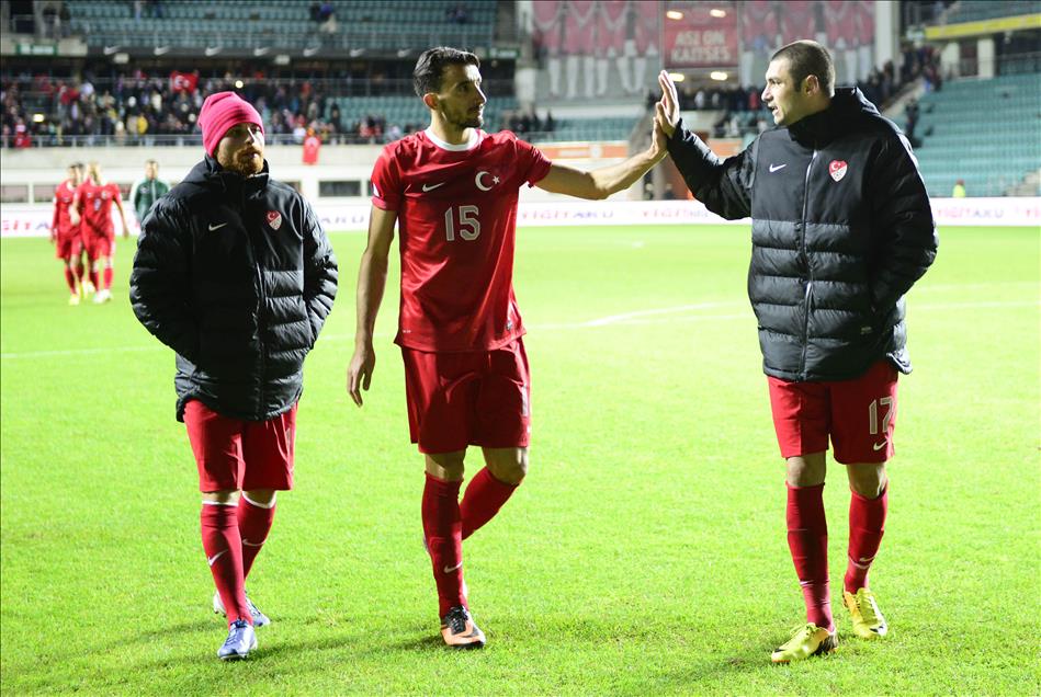 A Milli Futbol Takımı, 2014 Dünya Kupası Avrupa Elemeleri D Grubu'nda, Estonya ile A Le Coq Arena stadında karşı karşıya geldi. Maçı kazanan milli takım oyuncuları Mehmet Topal (ortada) ile Burak Yılmaz (sağda) birbirini tebrik etti. (Yakup Çabuk - Anadolu Ajansı)Yakup Çabuk
