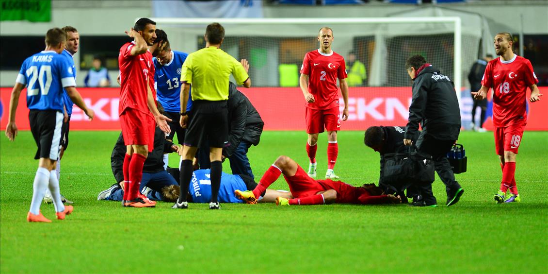 A Milli Futbol Takımı, 2014 Dünya Kupası Avrupa Elemeleri D Grubu'nda, Estonya ile A Le Coq Arena stadında karşı karşıya geldi. Bir pozisyon sonrası milli oyuncu Burak Yılmaz ile rakibi sakatlık geçirdi. (Yakup Çabuk - Anadolu Ajansı)Yakup Çabuk