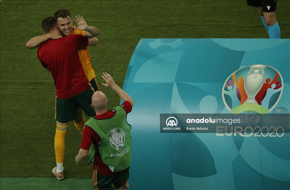 2020 Avrupa Futbol Şampiyonası (EURO 2020) A grubu ikinci maçında, A Milli Takım ile Galler milli takımı Azerbaycan’ın başkenti Bakü’deki Olimpiyat Stadı'nda karşı karşıya geldi. Karşılaşmada, Galler milli takımının futbolcusu Aaron Ramsey (sol 2) attığı golün ardından sevinç yaşadı. ( Burak Akbulut - Anadolu Ajansı )Burak Akbulut