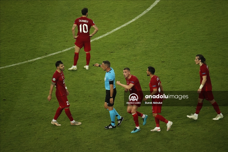 2020 Avrupa Futbol Şampiyonası (EURO 2020) A grubu ikinci maçında, A Milli Takım ile Galler milli takımı Azerbaycan’ın başkenti Bakü’deki Olimpiyat Stadı'nda karşı karşıya geldi. Karşılaşmada, A Milli Takım futbolcuları Merih Demiral (sağ 3), Çağlar Söyüncü (sağda) ve İrfan Can Kahveci (sağ 2), mücadelenin hakemi Artur Soares Dias'a (sol 3) bir pozisyonun ardından itirazda bulundu. ( Burak Akbulut - Anadolu Ajansı )Burak Akbulut