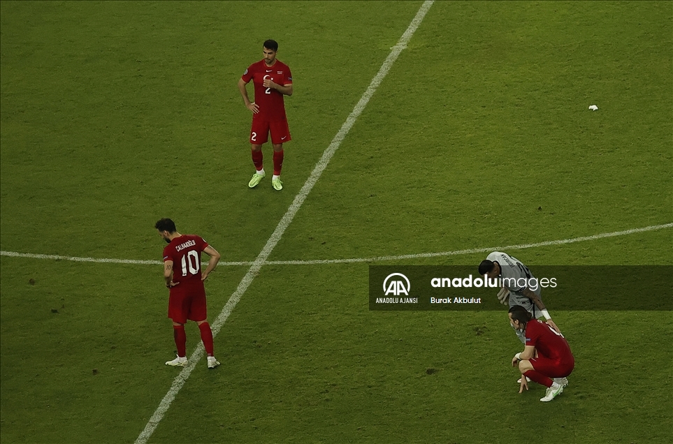 2020 Avrupa Futbol Şampiyonası (EURO 2020) A grubu ikinci maçında, A Milli Takım ile Galler milli takımı Azerbaycan’ın başkenti Bakü’deki Olimpiyat Stadı'nda karşı karşıya geldi. Karşılaşmayı kaybeden A Milli Takım futbolcuları Uğurcan Çakır (sağda), Çağlar Söyüncü (yerde-sağda), Hakan Çalhanoğlu (solda) ve Zeki Çelik (sol 2) üzüntü yaşadı. ( Burak Akbulut - Anadolu Ajansı )Burak Akbulut