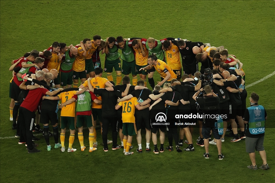 2020 Avrupa Futbol Şampiyonası (EURO 2020) A grubu ikinci maçında, A Milli Takım ile Galler milli takımı Azerbaycan’ın başkenti Bakü’deki Olimpiyat Stadı'nda karşı karşıya geldi. Karşılaşmayı kazanan Galler milli takımının futbolcuları sevinç yaşadı. Gareth Bale (ortada), takım arkadaşlarına konuşma yaptı. ( Burak Akbulut - Anadolu Ajansı )Burak Akbulut