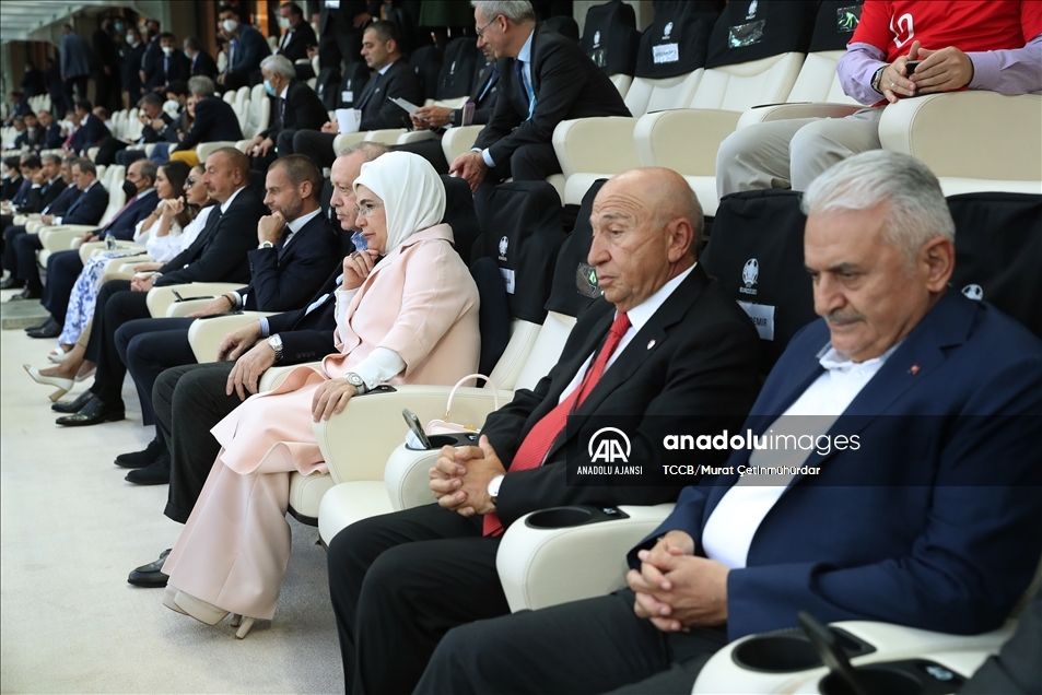 2020 Avrupa Futbol Şampiyonası (EURO 2020) A grubu ikinci maçında, A Milli Takım ile Galler milli takımı Azerbaycan’ın başkenti Bakü’deki Olimpiyat Stadı'nda karşı karşıya geldi. Maçı, Cumhurbaşkanı Recep Tayyip Erdoğan ve eşi Emine Erdoğan ile Azerbaycan Cumhurbaşkanı İlham Aliyev ve eşi Mehriban Aliyeva da izledi. ( TCCB/Murat Çetinmühürdar - Anadolu Ajansı )TCCB/Murat Çetinmühürdar