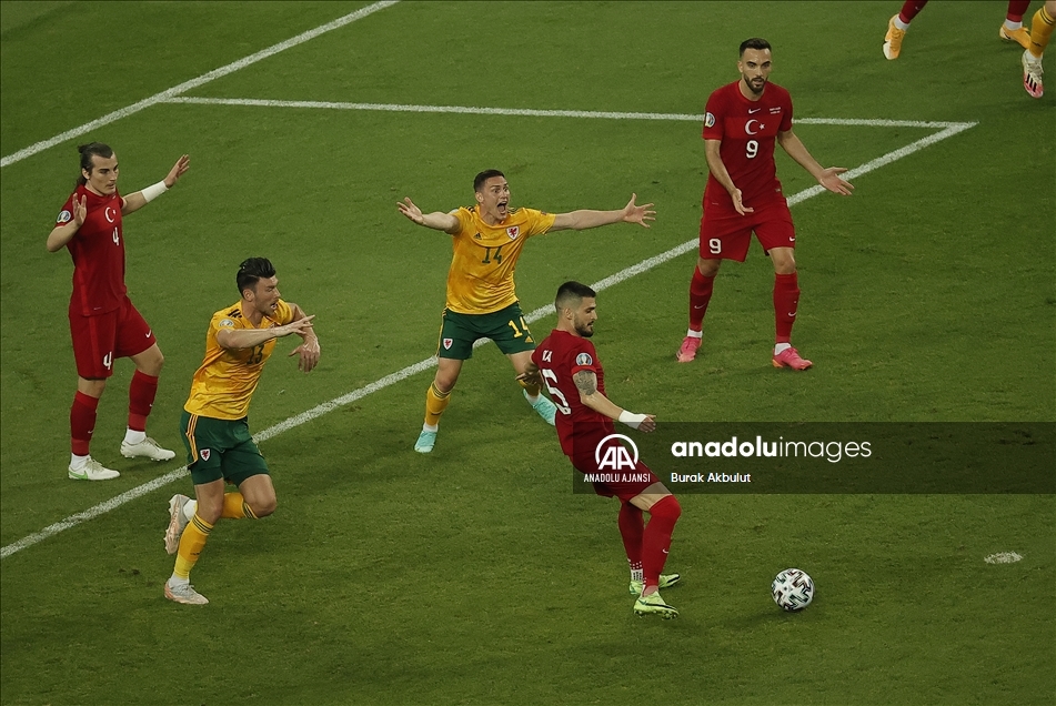 2020 Avrupa Futbol Şampiyonası (EURO 2020) A grubu ikinci maçında, A Milli Takım ile Galler milli takımı Azerbaycan’ın başkenti Bakü’deki Olimpiyat Stadı'nda karşı karşıya geldi. Karşılaşmada, Galler milli takımının futbolcuları Connor Roberts (sol 3) ve Kieffer Moore (sol 2), A Milli Takım futbolcusu Çağlar Söyüncü'nün (solda) pozisyonuna penaltı verilmesi gerekçesiyle mücadelenin hakemine itirazda bulundu. ( Burak Akbulut - Anadolu Ajansı )Burak Akbulut
