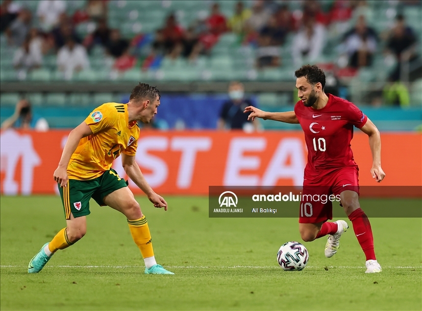 2020 Avrupa Futbol Şampiyonası (EURO 2020) A Grubu ikinci maçında A Milli Futbol Takımı, Bakü Olimpiyat Stadyumu’nda Galler ile karşılaştı. Bir pozisyonda A Milli Takım oyuncusu Hakan Çalhanoğlu (10) rakibi ile mücadele etti. ( Ali Balıkçı - Anadolu Ajansı )Ali Balıkçı