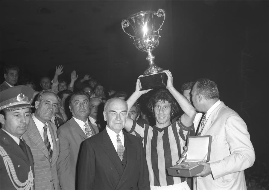 GALATASARAY ILE YAPTIGI FUTBOL KARSILASMASI SONUCU CUMHURBASKANLIGI KUPASINI KAZANAN FENERBAHCE, TAKIM KAPTANI NEDIM (ELINDE KUPA OLAN), KUPAYI CUMHURBASKANI FAHRI KORUTURK'TEN (ORTADA) ALDI. CUMHURBASKANLIGI BASYAVERI ALBAY HUSEYIN TOPA, GENCLIK VE SPOR BAKANI CELALETTIN COSKUN (SOL 3), FENERBAHCE BASKANI FARUK ILGAZ (SAGDA). (ANADOLU AJANSI - AA ARSIVI) (19730609) AA ARSIVI