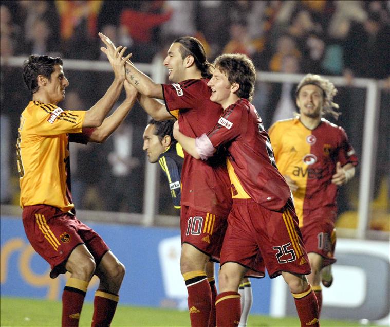 FORTIS TURKIYE KUPASI'NDAKI GALATASARAY ILE FENERBAHCE KARSILASTI. NECATI ATES (10) GOL SEVINCINI TAKIM ARKADASLARI CIHAN HASPOLATLI VE FERHAT OZTORUN (25) ILE PAYLASTI. (ANADOLU AJANSI / OKTAY CILESIZ) (20060322) OKTAY CILESIZ