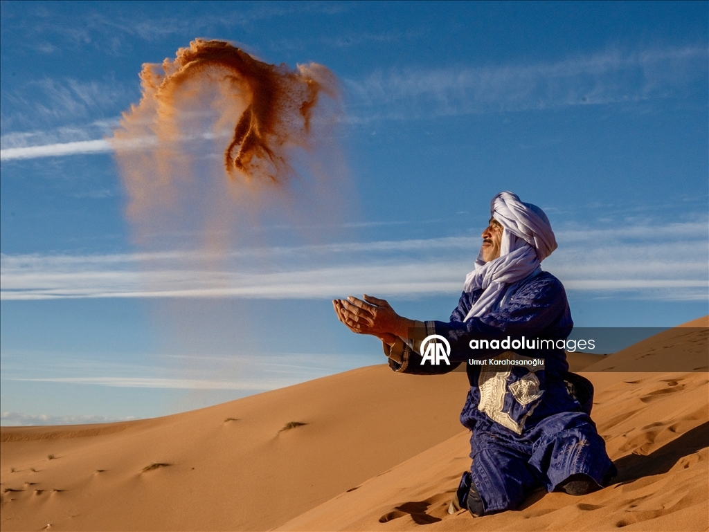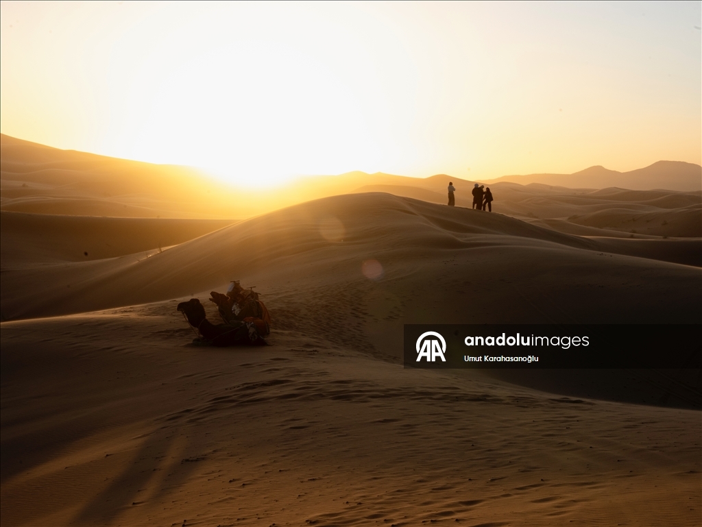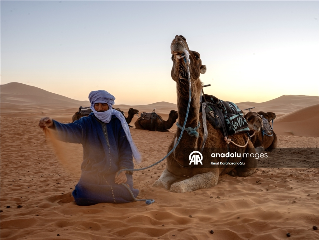 Fas’ın güneydoğusunda bulunan Merzouga bölgesindeki Erg Chebbi'de günlük yaşam görüntülendi. Sahra Çölü'nün batı ucunda yer alan bölgede yaşayan halk, çölü ziyaret eden gruplara develerle rehberlik ederken bu faaliyet yerel halk için önemli bir gelir kaynağı oluşturuyor. Kum çölü olarak sınıflandırılan çölde, gün içinde hava sıcaklığının artmasıyla hareketlilik azalırken akşam saatlerinde yeniden canlanıyor. ( Umut Karahasanoğlu - Anadolu Ajansı )Umut Karahasanoğlu