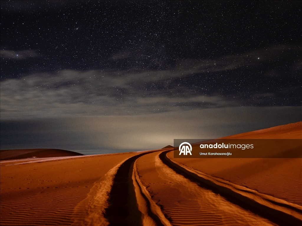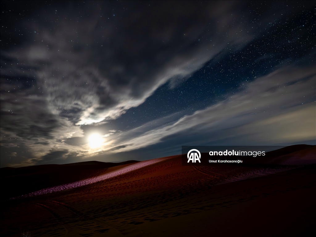 Fas’ın güneydoğusunda bulunan Merzouga bölgesindeki Erg Chebbi'de günlük yaşam görüntülendi. Sahra Çölü'nün batı ucunda yer alan bölgede yaşayan halk, çölü ziyaret eden gruplara develerle rehberlik ederken bu faaliyet yerel halk için önemli bir gelir kaynağı oluşturuyor. Kum çölü olarak sınıflandırılan çölde, gün içinde hava sıcaklığının artmasıyla hareketlilik azalırken akşam saatlerinde yeniden canlanıyor. Gece yıldızlarla aydınlanan Erg Chebbi, sessiz ve sakin görüntüler sunuyor. ( Umut Karahasanoğlu - Anadolu Ajansı )Umut Karahasanoğlu