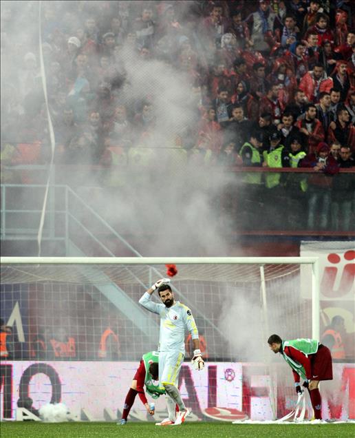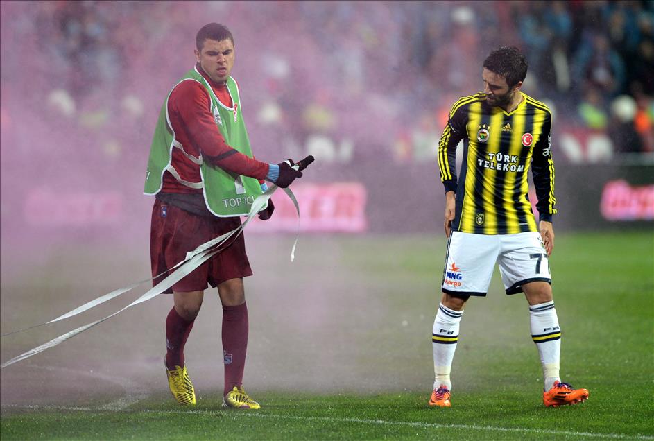 Spor Toto Süper Lig'de Trabzonspor ile Fenerbahçe karşı karşıya geldi. İlk yarının uzatma dakikalarında tribünlerdeki taraftarların sahaya attığı yabancı maddeler nedeniyle, karşılaşmanın hakemi maçı tatil etti. (İbrahim Hakkı ŞAHİN - Anadolu Ajansı)İbrahim Hakkı ŞAHİN