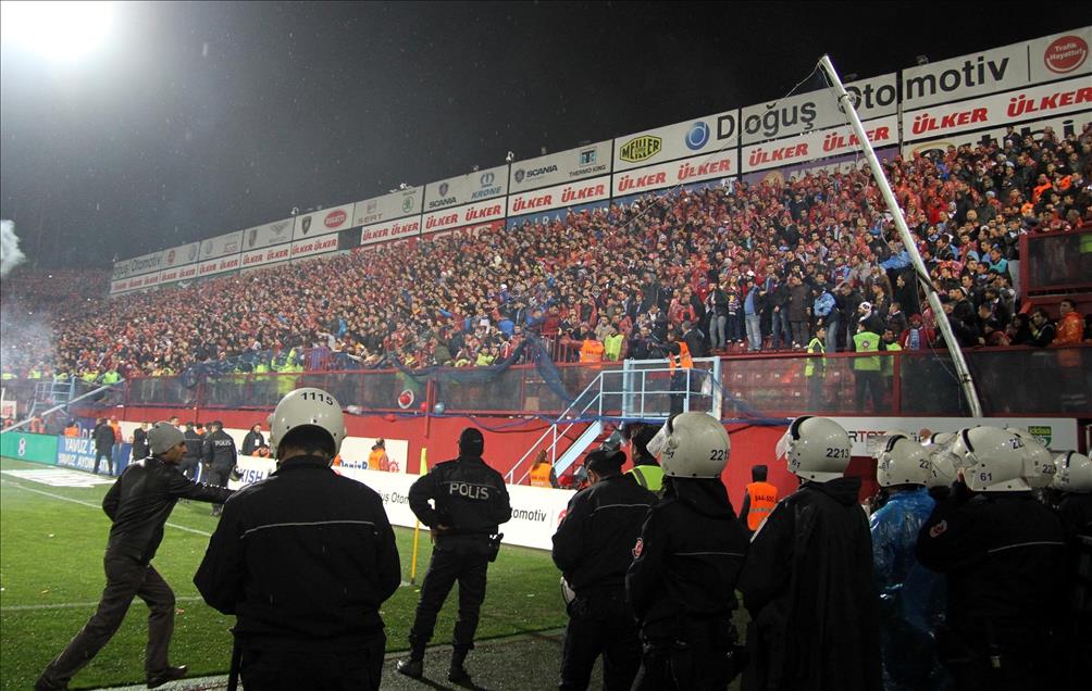 Spor Toto Süper Lig'de Trabzonspor ile Fenerbahçe karşı karşıya geldi. İlk yarının uzatma dakikalarında tribünlerdeki taraftarların sahaya attığı yabancı maddeler nedeniyle, karşılaşmanın hakemi maçı tatil etti. Kale arkasındaki ağları tutan direkler kırıldı. (İbrahim Hakkı ŞAHİN - Anadolu Ajansı)İbrahim Hakkı ŞAHİN