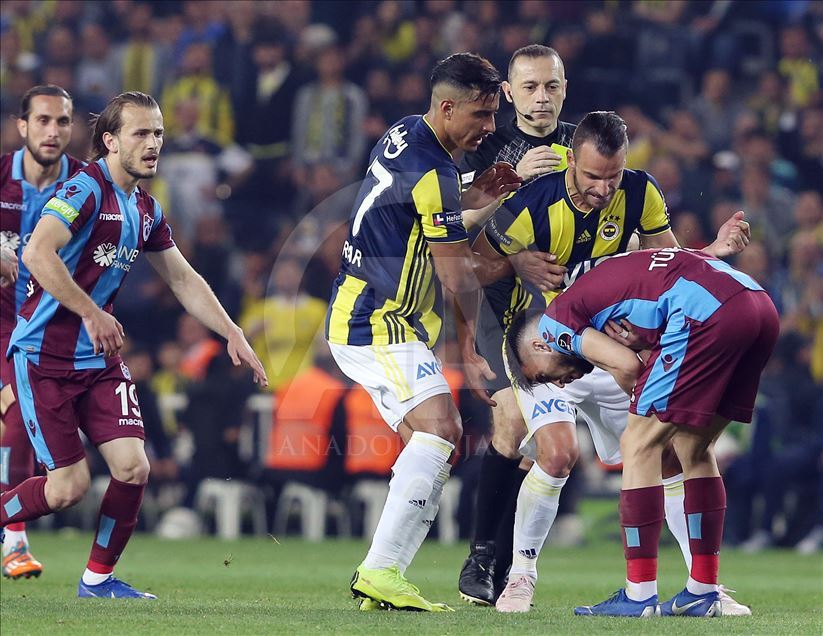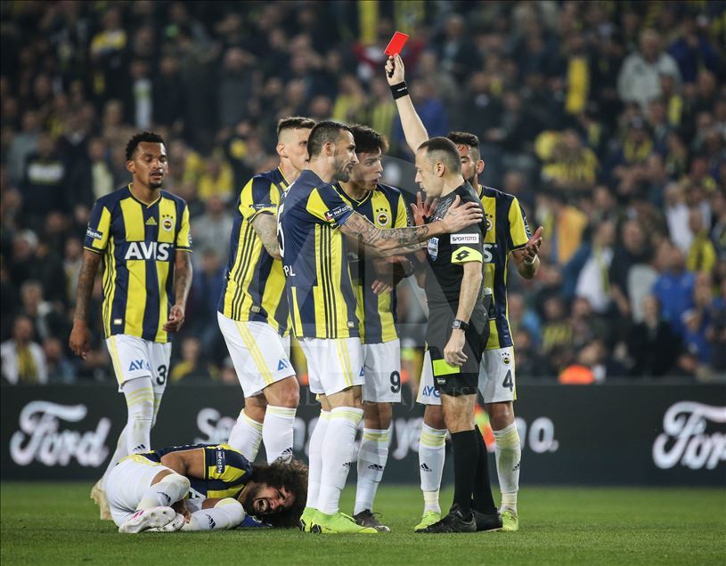 Spor Toto Süper Lig'in 30. haftasında Fenerbahçe ile Trabzonspor takımları, Ülker Stadyumu'nda karşılaştı. Karşılaşmada Fenerbahçe takım oyuncusu Sadık Çiftpınar (yerde), kırmızı kart görerek oyun dışı kaldı. ( Şebnem Coşkun - Anadolu Ajansı )Şebnem Coşkun