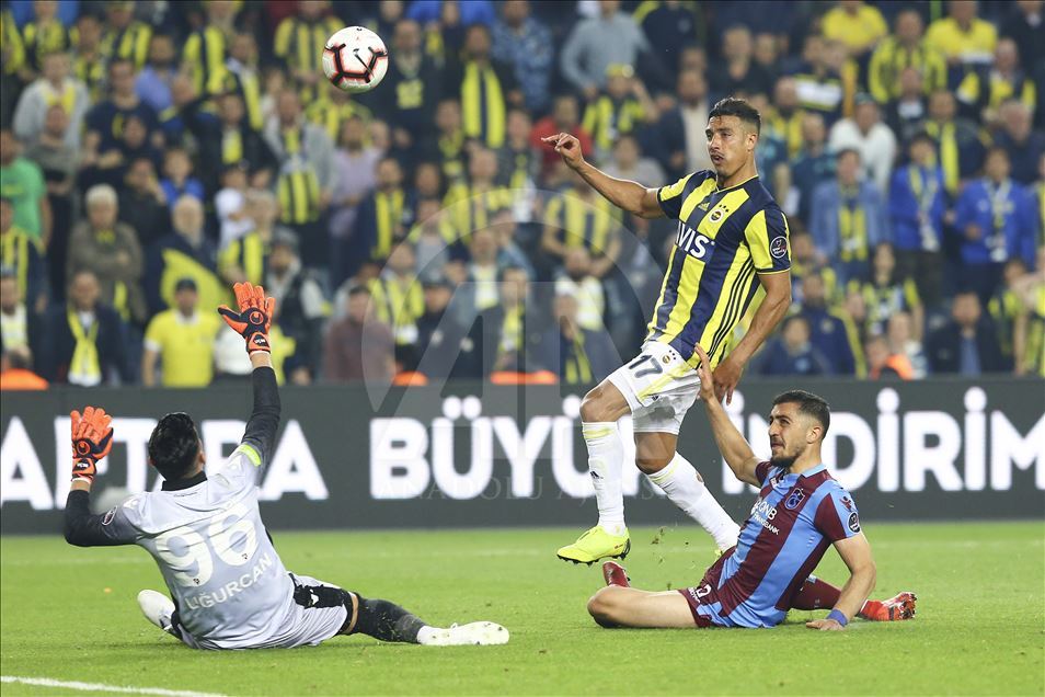Spor Toto Süper Lig'in 30. haftasında Fenerbahçe ile Trabzonspor takımları, Ülker Stadyumu'nda karşılaştı. Fenerbahçeli oyuncu Nabil Dirar (17), bir pozisyonda Trabzonspor kalecisi Uğurcan Çakır (96) ve Majid Hosseini (sağda) ile mücadele etti. ( Serhat Çağdaş - Anadolu Ajansı )Serhat Çağdaş