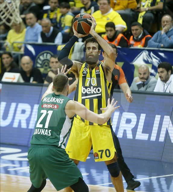 Fenerbahçe Beko, THY Avrupa Ligi play-off çeyrek final ikinci maçında Litvanya temsilcisi Zalgiris ile karşı karşıya geldi. Fenerbahçe Bekolu oyuncu Luigi Datome (70) ile Zalgirisli basketbolcu Arturas Milaknis (21), bir pozisyonda mücadele etti. ( Erhan Elaldı - Anadolu Ajansı )Erhan Elaldı