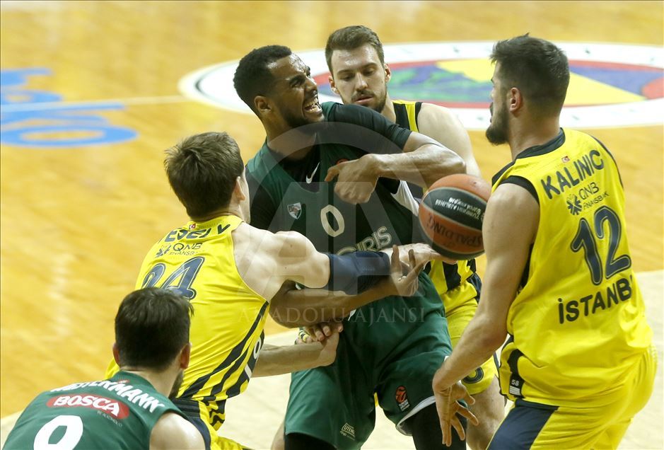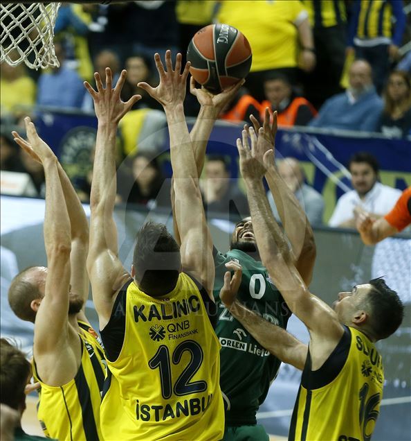 Fenerbahçe Beko, THY Avrupa Ligi play-off çeyrek final ikinci maçında Litvanya temsilcisi Zalgiris ile karşı karşıya geldi. Fenerbahçe Bekolu oyuncular Sinan Güler (solda), Nikola Kalinic (12) ve Kostas Sloukas (sağda) ile Zalgirisli basketbolcu Brandon Davies (0), bir pozisyonda mücadele etti. ( Erhan Elaldı - Anadolu Ajansı )Erhan Elaldı