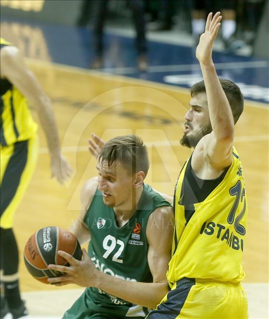 Fenerbahçe Beko, THY Avrupa Ligi play-off çeyrek final ikinci maçında Litvanya temsilcisi Zalgiris ile karşı karşıya geldi. Fenerbahçe Bekolu oyuncu Nikola Kalinic (12) ile Zalgirisli basketbolcu Edgaras Ulanovas (92), bir pozisyonda mücadele etti. ( Erhan Elaldı - Anadolu Ajansı )Erhan Elaldı