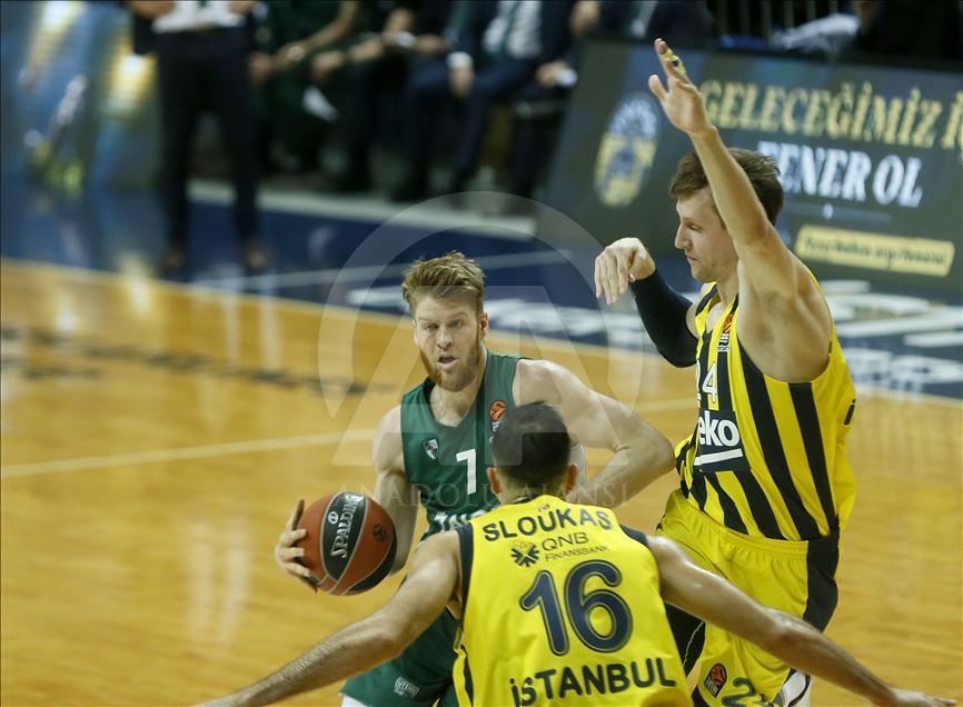 Fenerbahçe Beko, THY Avrupa Ligi play-off çeyrek final ikinci maçında Litvanya temsilcisi Zalgiris ile karşı karşıya geldi. Fenerbahçe Bekolu oyuncular Kostas Sloukas (16) ve Jan Vesely (24) ile Zalgirisli basketbolcu Thomas Walkup (7), bir pozisyonda mücadele etti. ( Erhan Elaldı - Anadolu Ajansı )Erhan Elaldı
