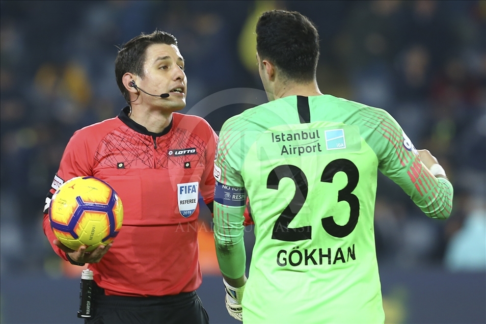 Spor Toto Süper Lig'in 24. haftasında Fenerbahçe ile Çaykur Rizespor takımları, Ülker Stadyumu'nda karşılaştı. İlk yarı sonunda Çaykur Rizespor kalecisi Gökhan Akkan (23), mücadelenin hakemi Halil Umut Meler ile bir pozisyon için itiraz etti. ( Serhat Çağdaş - Anadolu Ajansı )Serhat Çağdaş