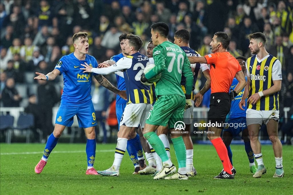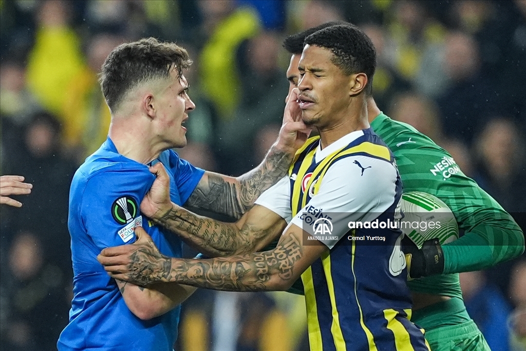 UEFA Avrupa Konferans Ligi son 16 turu ikinci maçında, Fenerbahçe ile Belçika ekibi Union Saint-Gilloise Ülker Stadyumu’nda karşılaştı. Bir pozisyon sonrası Fenerbahçe oyuncusu İrfan Can Eğribayat (sağda) ve Jayden Oosterwolde (sağ 2), Union Saint-Gilloise oyuncusu Dennis Eckert Ayensa (solda) ile tartıştı.