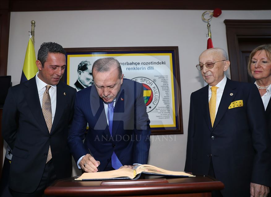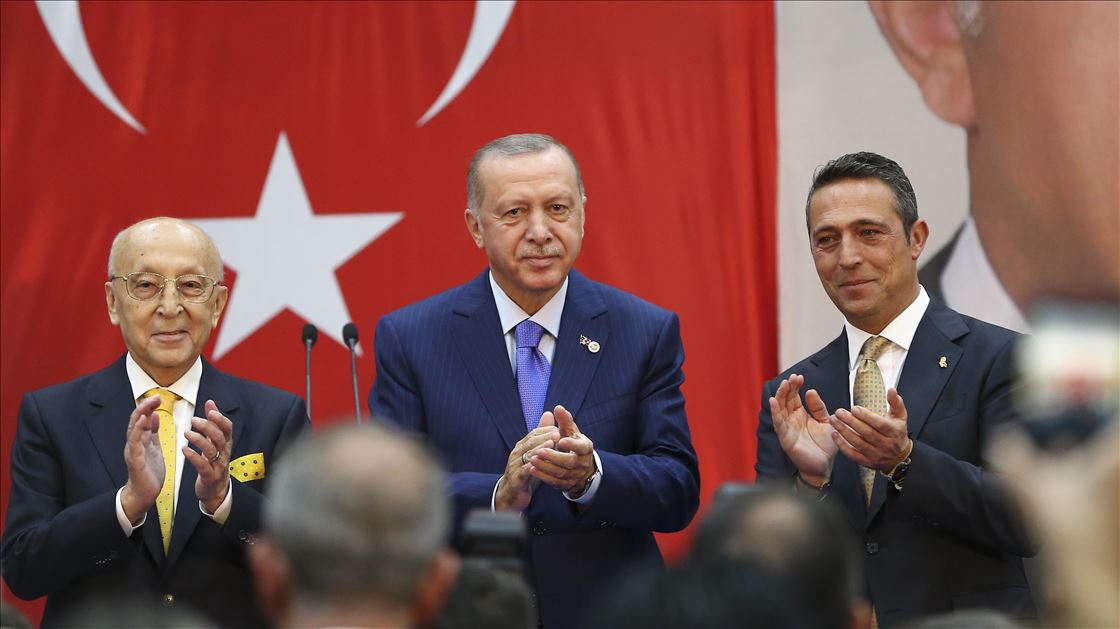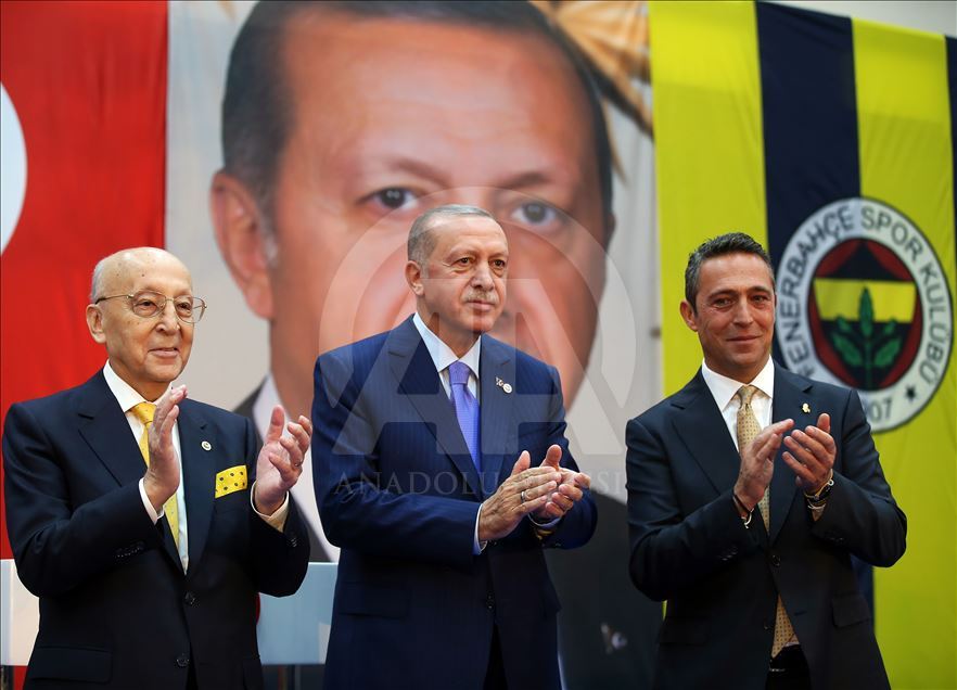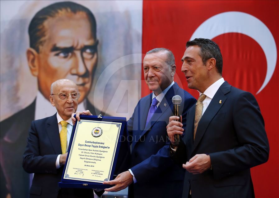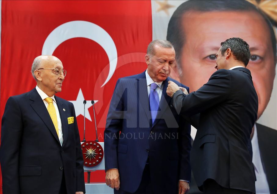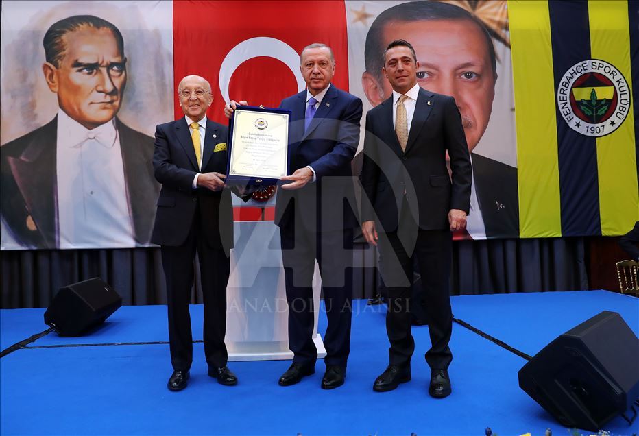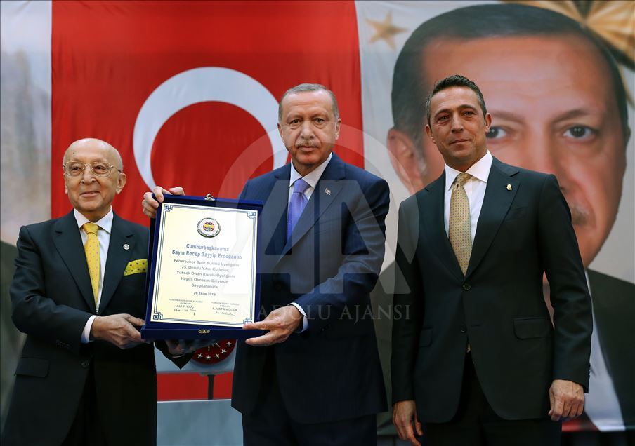 Türkiye Cumhurbaşkanı Recep Tayyip Erdoğan (ortada), Fenerbahçe Yüksek Divan Kurulu Olağan Toplantısı'na katıldı. Fenerbahçe Spor Kulübü Başkanı Ali Koç (sağda) ve Yüksek Divan Kurulu Başkanı Vefa Küçük (solda) Cumhurbaşkanı Erdoğan'a Fenerbahçe Spor Kulübü üyeliğinin 25. yılı anısına rozet takdim etti. ( Cumhurbaşkanlığı / Murat Çetinmühürdar - Anadolu Ajansı )Cumhurbaşkanlığı / Murat Çetinmühürdar